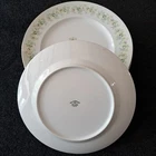 This set of 4 vintage 10.25" dinner plates from Johann Haviland's Forever Spring Platinum collection is an elegant addition to any dining ware collection. The round plates have a diameter of 10.25 inches and feature a beautiful floral pattern with a glossy finish. Made of bone china, these plates are original vintage pieces from Germany and are perfect for all occasions. Whether you are a collector or just looking for replacement pieces, these Haviland dinner plates are sure to impress. Please note, a few of the plates are showing wear along the platinum edge.