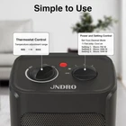 JNDRO Portable Electric Space Heater - 1500W/750W Quiet Ceramic mini Black Product Details Brand: JNDRO Special Feature: Overheat Protection, Tip-Over Protection, Portable Color: Black Form Factor: Mat Indoor/Outdoor Usage: Indoor Product Dimensions: 4.9"D x 6.3"W x 8.9"H Recommended Uses For Product: Home Mounting Type: Tabletop Mount Room Type: Office, indoor, Study Room, Bedrooom, home Heating Coverage: 200 square_feet Burner type: Radiant Heat Output: 1500 Degrees Fahrenheit Fuel Type: Electric Number of Speeds: 3 Voltage: 120 Volts (AC) Manufacture Year: 2023 Item Weight: 2.68 pounds Manufacturer: JNDRO Item model number: PTC-903 Power SourceHeating Method: ACRadiant 2 in 1 Heater and Air Fan:The small heater offers two heat settings, 1500W or 750W, along with a cooling fan function, making it usable in both winter and summer. The heater's thermostat control automatically shuts off the heating element when the preset temperature is reached, and it reactivates the heater when the temperature falls below the thermostat setting. Multiple Safety Protections:The space heater is constructed from flame-resistant materials, utilizing an upgraded version of ABS material that enhances flame resistance, effectively mitigating any risk of fire hazard. The Overheat Protection feature automatically shuts down the heater when it reaches a critical temperature. The tip-over protection system also deactivates the heater if accidentally tipped over; upon righting the heater, it resumes operation. Compact and Portable:The heater for indoor use measures 6.2 inches x 7 inches x 10.2 inches and weighs 2.9 pounds. It comes with a 6-foot power extension cord and an integrated handle, allowing convenient mobility for use in offices, rooms, and on desks. The mini heater is designed to heat up 200 square feet. Quiet and Rapid Heating:The portable heater operates with noise levels below 46 decibels, ensuring a tranquil environment suitable for most individuals to use while sleeping in bedrooms. Employing PTC ceramic heating technology and a high-speed fan, this heater is capable of emitting substantial heat within seconds, rapidly warming spaces of up to 200 square feet. JNDRO After Sale Service:ETL Certified, Our friendly and reliable customer service will respond to you within 24 hours. You can purchase with confidence, with our 30-day return and 12-month replacement.