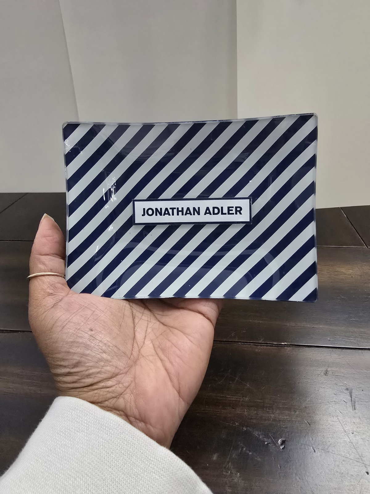The Jonathan Adler Glass Catch-all Tray in Navy Striped is a stylish and modern soap dish for adult bathrooms. Made of glass with a polished finish, this 6x4 inch dish is perfect for keeping your soap bar secure and dry. The navy striped design adds a touch of elegance to any bathroom decor, making it both functional and aesthetically pleasing. With no assembly required, this soap dish is a convenient and practical addition to your home.