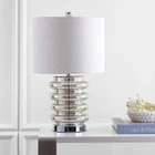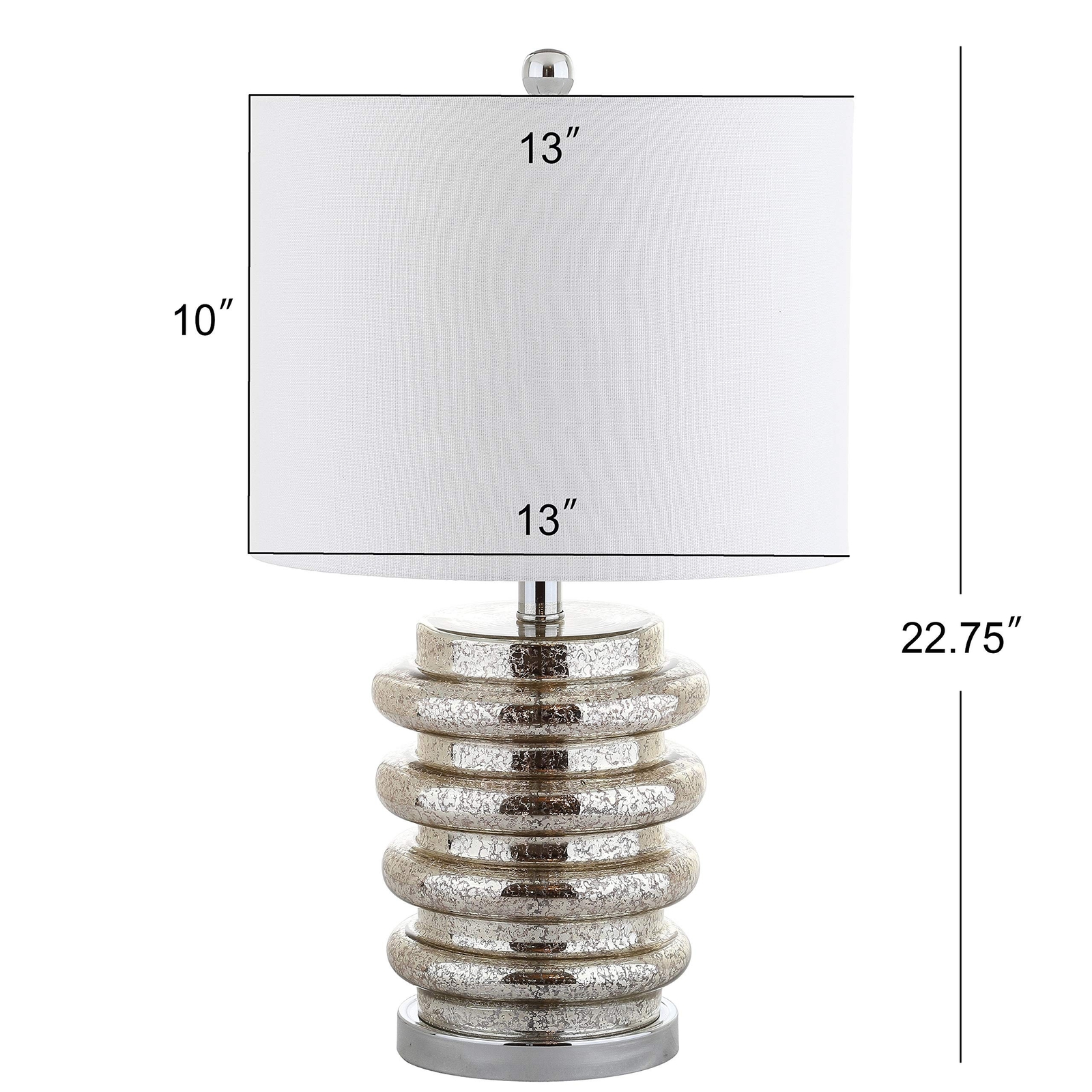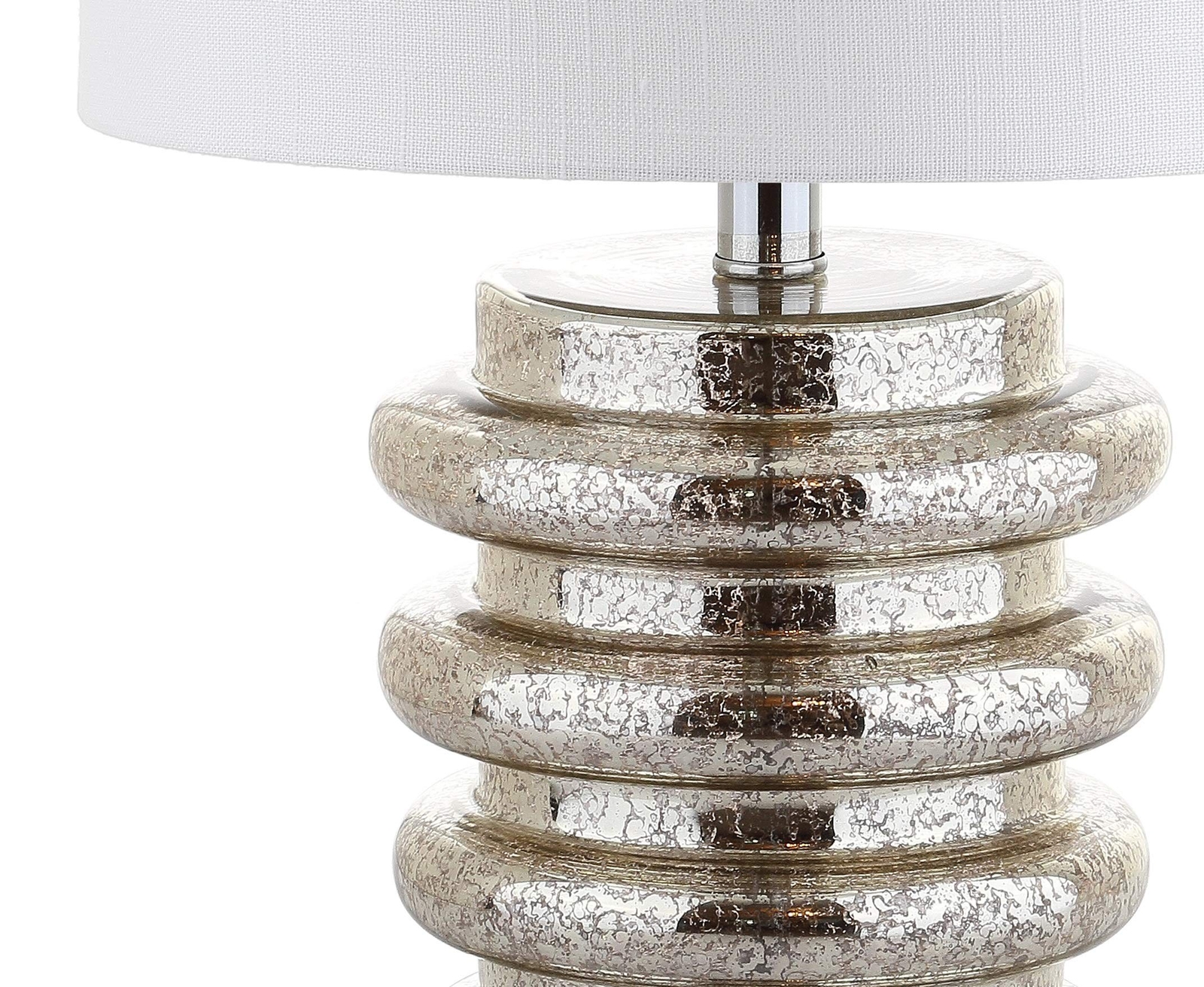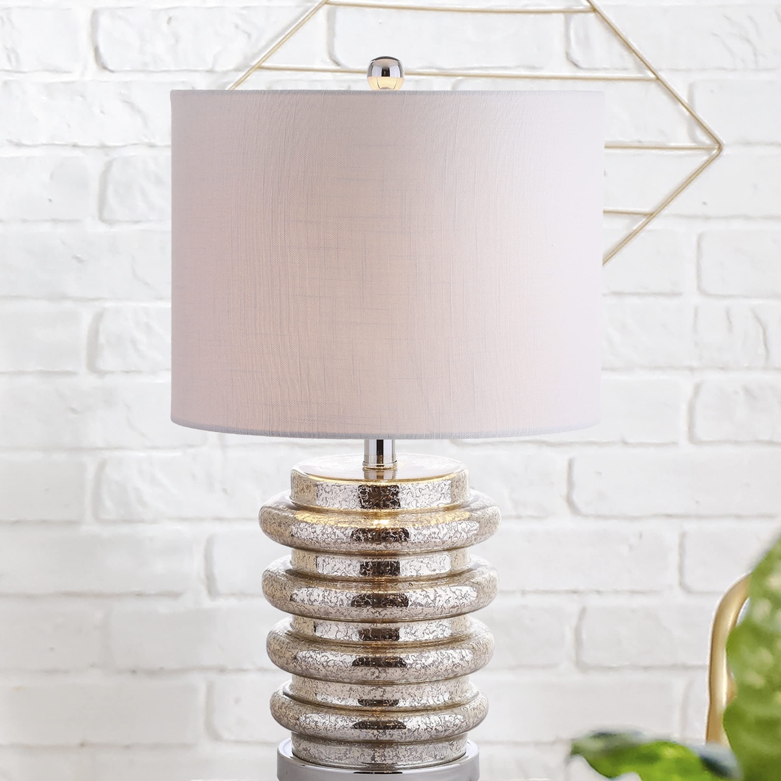 JONATHAN Y JYL1074A Allen 22.75" LED Glass Table Lamp Contemporary Transitional Bedside Desk Nightstand Lamp for Bedroom Living Room Office College Bookcase LED Bulb Included, Mercury Silver Product Details Finish Type: Painted Base Material: Iron Bulb Base: E26 Product Dimensions: 13"D x 13"W x 22.75"H Item Weight: 4.8 Pounds Finish Type: Painted Base Material: Iron Bulb Base: E26 Product Dimensions: 13"D x 13"W x 22.75"H Item Weight: 4.8 Pounds Lamp Type: Table Lamp Shade Color: White Shade Material: Linen Switch Type: Rotary Style: Contemporary, Transitional Brand: JONATHAN Y Color: Mercury Silver Special Feature: Corded Light Source Type: LED Material: Glass Room Type: Office, Entryway, Bedroom, Living Room, College Dorm Recommended Uses For Product: for Bedroom, Living Room, Office, College Dorm, Coffee Table, Bookcase, Reading, Decoration Power Source: Corded Electric Shape: Drum Number of Light Sources: 1 Connectivity Technology: Normal bulb Included Components: 1 Lamp, 1 Bulb Is Waterproof: False Bulb Shape Size: A19 Mounting Type: Tabletop Wattage: 100 watts Number of Items: 1 Lighting Method: Adjustable Indoor/Outdoor Usage: Indoor Specific Uses For Product: Indoor use only, Decoration Installation Type: Countertop Number of Pieces: 1 Voltage: 120 Volts Base Diameter: 5 Inches Brightness: 800 Lumen Is Cordless?: No UPC: 819727023472 Global Trade Identification Number: 72 Manufacturer: JONATHAN Y Part Number: JYL1074A Item Weight: 4.84 pounds Country of Origin: China Item model number: JYL1074A Size: 22.75 in Finish: Painted Pattern: Solid Item Package Quantity: 1 Cutting Diameter: 13 Inches Certification: UL, ETL Special Features: Corded Batteries Required?: No Warranty Description: 30 day manufacturer warranty for defects only, for warranty information on this product, please call the internet customer service center. Normal wear and tear is not warranted. Visible damages not noted upon delivery will be determined to be customer damage and will not be warranted. All products are inspected upon arrival and we do not accept worn, dirty or stained merchandise. Assembled Diameter: 13 Inches Date First Available: August 10, 2018 QUALITY CONSTRUCTION: JONATHAN Y table lamps designed to illuminate your home, stylish addition to any room; included LED bulbs and our lamps fit standard light bulbs too! ETL Listed and meets 120-volt UL standards for safety and quality ENERGY-SAVING LED BULBS INCLUDED: Compatible with Alexa smart outlets (sold separately), our sturdy LED bulbs will still last multiple years; high-quality LED bulbs are an energy-saving upgrade over standard incandescent bulbs SATISFACTION GUARANTEED: Every JONATHAN Y design is created with uncompromising attention to detail, using only the highest quality components; Based in Soho, New York, designer Jonathan and his talented team create affordable high-end home decor Mercury glass gets a modern update in a variegated glass silhouette 100% cotton hardback drum shade A mercury glass vessel with variegated ribs dazzles in this silver patina finish. A futuristic design in silhouette, the addition of a classic silver finish warms this style with traditional ease. The design features a silk- wrapped cord and chrome finial, while up top is a white fabric drum shade.