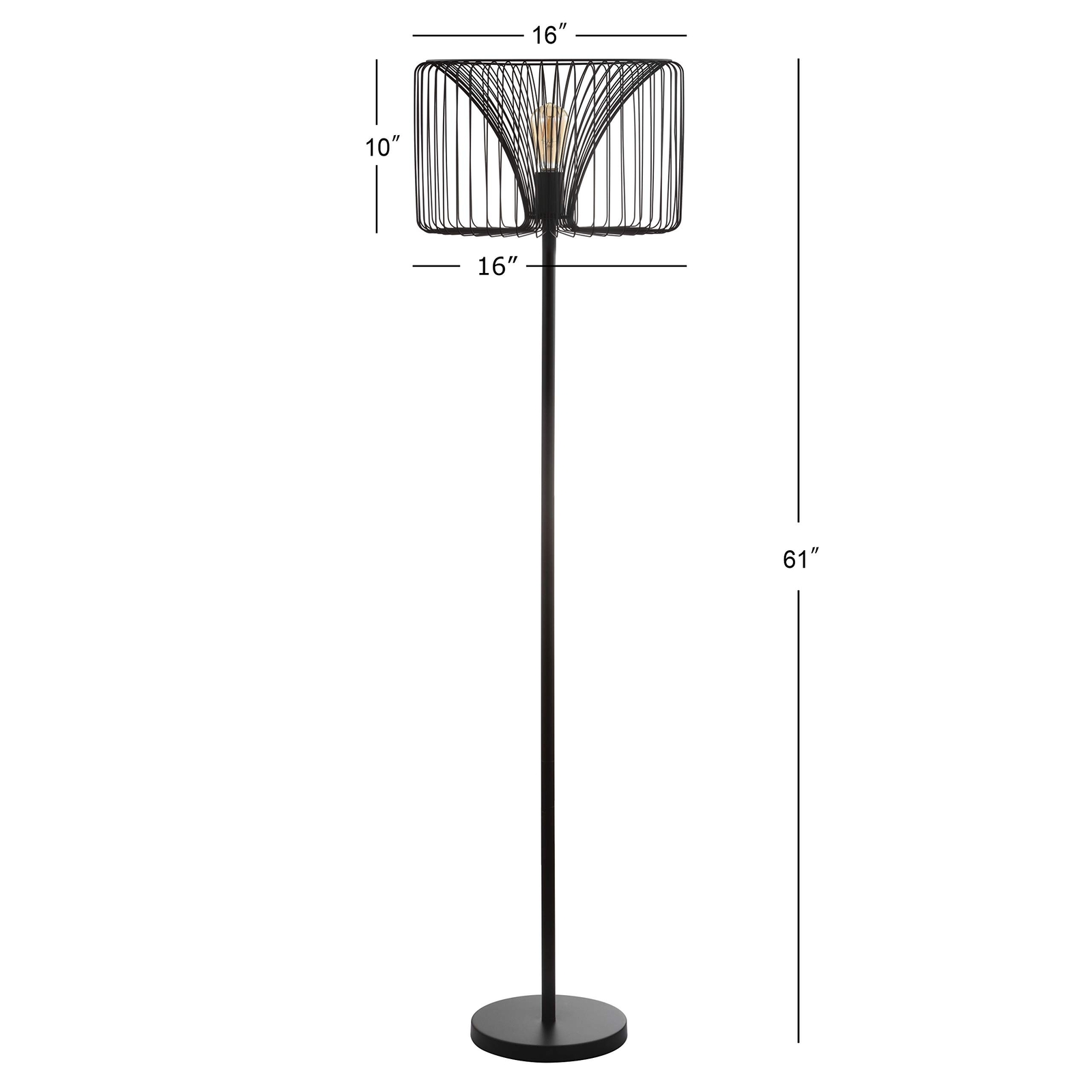 JONATHAN Y JYL6105A Gridley 61" Metal LED Floor Lamp, Contemporary, Transitional, Modern, Industrial Style, Office, Living Room, Family Room, Dining Room, Bedroom, Hallway, Foyer, Black Product Details Finish Type: Plated Chrome Base Material: Metal Bulb Base: E26 Product Dimensions: 16"D x 16"W x 61"H Lamp Type: Floor Lamp Finish Type: Plated Chrome Base Material: Metal Bulb Base: E26 Product Dimensions: 16"D x 16"W x 61"H Lamp Type: Floor Lamp Shade Color: Clear Shade Material: Metal Switch Type: Footstep Style: Contemporary Brand: JONATHAN Y Color: Black Special Feature: bulbs included Light Source Type: LED Material: Metal Room Type: Living Room Recommended Uses For Product: Decoration, Reading Power Source: Corded Electric Shape: Candle Number of Light Sources: 1 Connectivity Technology: IR Included Components: 1 lamp Is Waterproof: False Bulb Shape Size: B10 Mounting Type: Floor Mount Wattage: 60 watts Number of Items: 1 Lighting Method: Up/Down Light Control Method: Touch Indoor/Outdoor Usage: Indoor Specific Uses For Product: Reading, Decoration Water Resistance Level: Not Water Resistant Installation Type: Tabletop,Freestanding Number of Pieces: 1 Efficiency: Energy-efficient Voltage: 120 Volts Base Diameter: 11 Inches Brightness: 420 Lumen Is Cordless?: No UPC: 819727025636 Global Trade Identification Number: 36 Manufacturer: JONATHAN Y Shade Height: 63.75 Inches Part Number: JYL6105A Item Weight: 6.27 pounds Country of Origin: China Item model number: JYL6105A Finish: Plated Chrome Pattern: Solid Item Package Quantity: 1 Special Features: bulbs included Batteries Required?: No Warranty Description: 30 day manufacturer warranty for defects only, for warranty information on this product, please call the internet customer service center. Normal wear and tear is not warranted. Visible damages not noted upon delivery will be determined to be customer damage and will not be warranted. All products are inspected upon arrival and we do not accept worn, dirty or stained merchandise. Date First Available: September 28, 2018 QUALITY CONSTRUCTION: JONATHAN Y table lamps designed to illuminate your home, stylish additio; included LED bulbs and our lamps fit standard light bulbs too! ETL Listed and meets 120-volt UL standards for safety and quality ENERGY-SAVING LED BULBS INCLUDED: LED bulbs provide soft, flicker-free lighting; JONATHAN Y LED bulbs have a lifespan of 25,000 hours; Will still last multiple years; Our high-quality LED bulbs are an energy-saving upgrade SATISFACTION GUARANTEED: Every JONATHAN Y design is created with uncompromising attention to detail, using only the highest quality components; Based in Soho, New York, designer Jonathan and his talented team create affordable high-end home decor Industrial and modern elements combine to stunning effect in this wire shaded floor lamp A silk-wrapped 72" cord features a step on/off switch for operating the light Light up your home while adding unique style with this modern wire-shaded floor lamp. Topped with a black wire cage that acts as the shade, this style achieves a unique industrial ambiance and looks best with and Edison bulb to complete the look. Turn of the century steampunk style is given a modern update though in the simplicity to operate -- the silk-wrapped cord features a foot-step on/off switch.