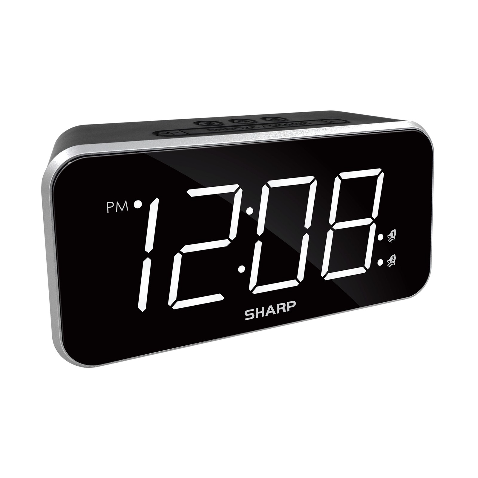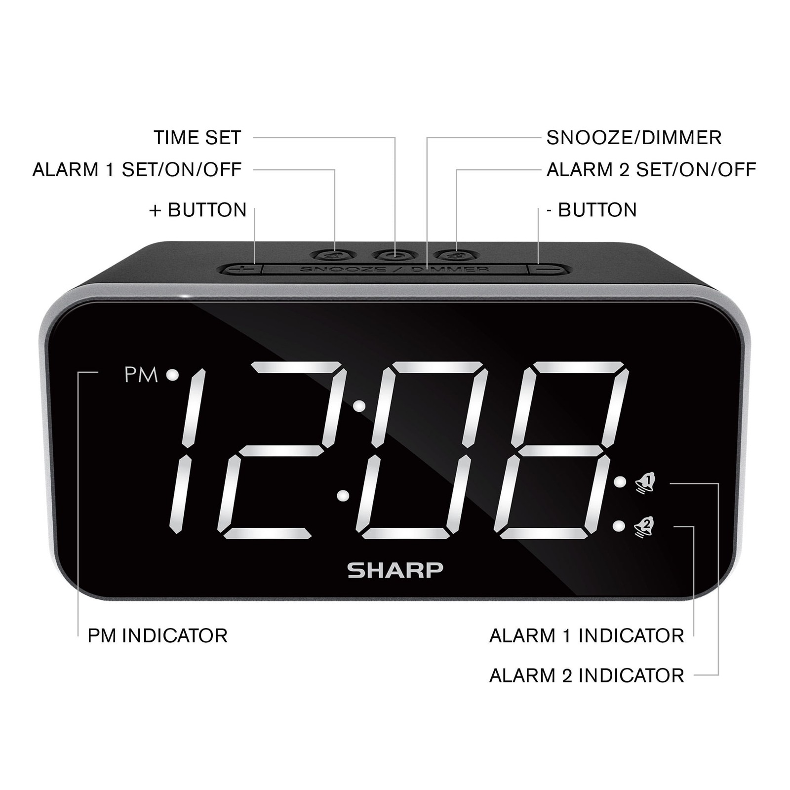 Sharp Alarm Clock with Extra Large Easy-to-Read 1.8" White LED Display and Black - Three-Level Dimming Control. The extra large 1.8" display shines through the black . You can adjust the display brightness to suit your viewing experience using the three-level dimming control button. This is a bright clock, but you can easily adjust the brightness. The Alarm Clock allows you to set two separate alarm times; for example, set one alarm for weekdays and another for weekends. When the alarm indicator on the display illuminates, you can clearly see when the alarm is active. This clock is electric; the battery backup power does not power the clock. The battery backup power is used to store the time and alarm settings if the power is interrupted. During the period of battery backup power, the clock's display will not illuminate. Once power is restored, the display will illuminate again. Check the time to it is accurate and reset it if necessary. Battery Backup: Requires 2 AAA Batteries (not included) Large 1.8" LED Display Three-Level Dimming Control Alarm Battery Backup: Requires 2 AAA Batteries (not included) Product Dimensions (6.88" L, 2" W, 3.31" H) No Assembly Required Product Color: Black with White LED Display