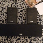 This is a KLH Dolby Pro Logic Speaker System Model #2410. It includes 2 rear and 1 center speakers with a rectangular shape, black metal construction, and high-fidelity sound quality. The speakers have Dolby Pro Logic surround sound format, bookshelf form factor, and wired connectivity with wire inputs. The center speaker has a power range of 5-50w and weighs 10.8 lbs.