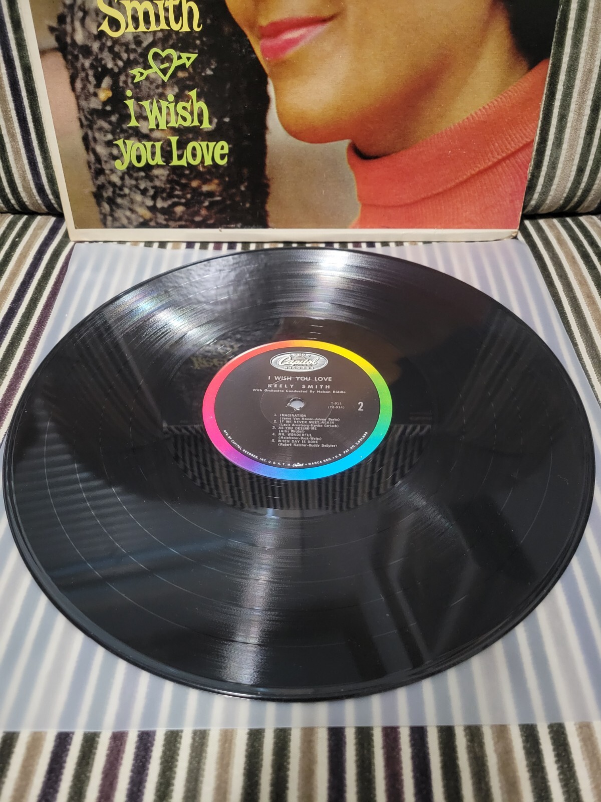 This is a rare and highly sought-after first edition LP by Keely Smith, titled "I Wish You Love" and released by Capitol Records in 1958. The vinyl record has been graded as Excellent (EX) and comes with the original cover. The cardboard sleeve has been graded as Very Good Plus (VG+). The album features big band and swing, vocal jazz, and pop and jazz genres, with Nelson Riddle conducting the orchestra. The record is 12" in size and has a speed of 33 RPM. This LP is a must-have for any vinyl record collector and a true gem for fans of Keely Smith's music.