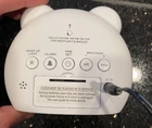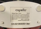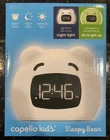 This Capello kids alarm clock in white features a digital display with a bear theme. It functions as a wake-up light and alarm clock. When the alarm goes off, the clock turns green. Made of plastic, it is designed for a child's bedroom to help them wake up in a fun and gentle way. Used just a few days. Then switched to Alexa. Please see photos.