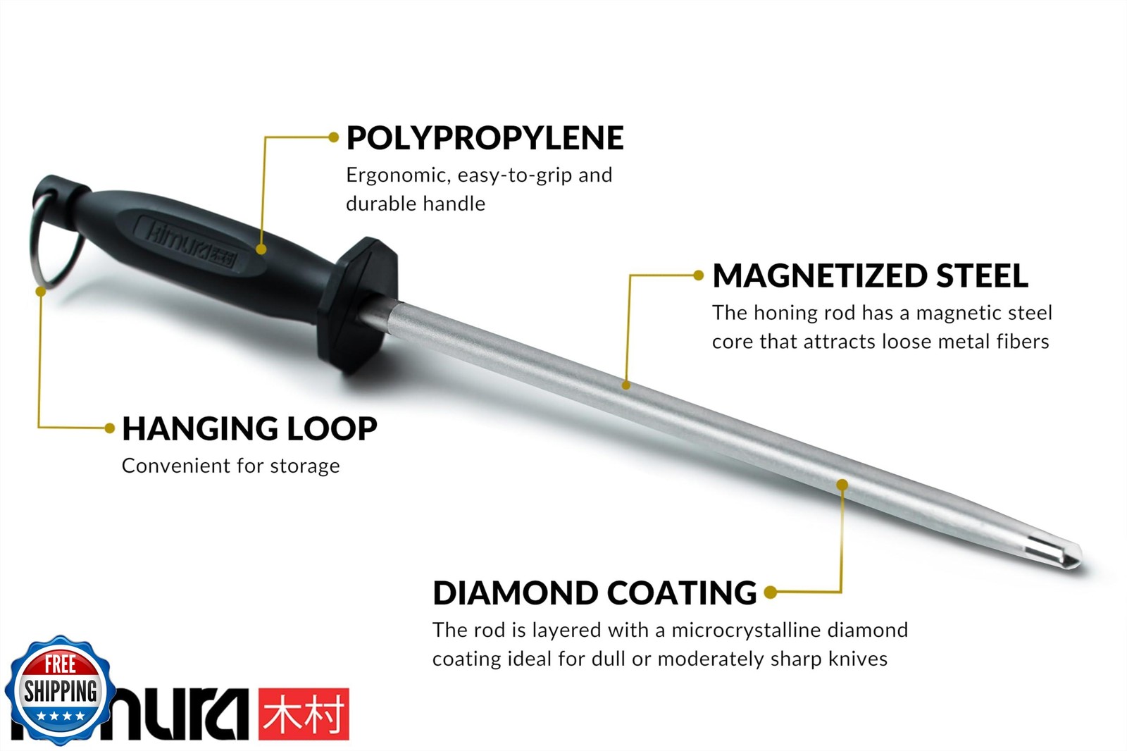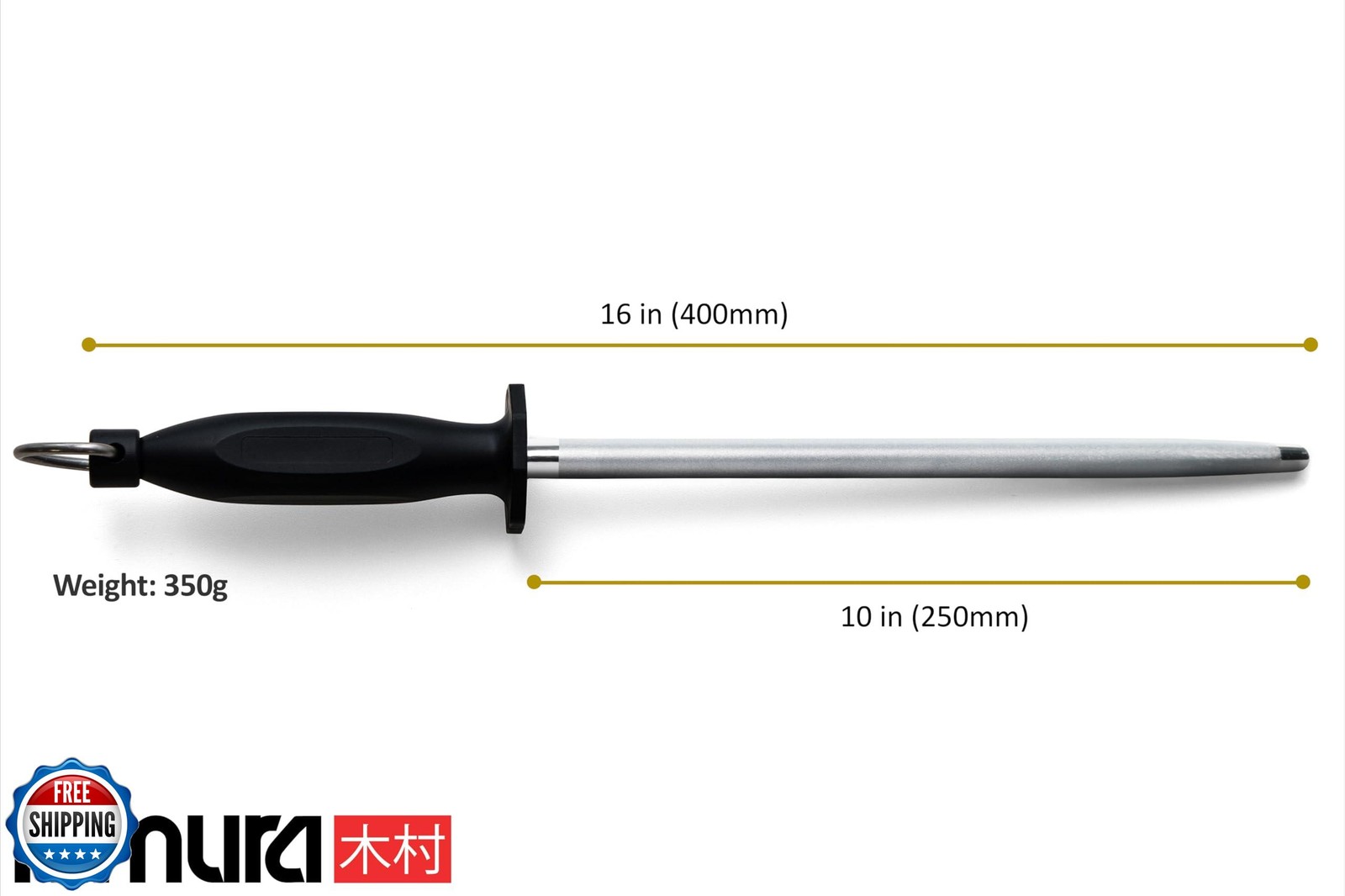 Kimura Professional Diamond Honing Rod, 10 Inch, Silver, Extra Fine Grit, Magnetized, Ergonomic Handle, Versatile Knife Sharpener, Japanese Gift Box Features [ PREMIUM MATERIALS ] - The 10 inch honing rod is made from microcrystalline diamond coated carbon steel that is enhanced and smoothened with Kimura’s proprietary diamond plating process. The honing steel is also magnetized for additional safety. [ ERGONOMIC HANDLE ] - The diamond honing rod's polypropylene handle is non-slip and easy to grip offering superior comfort, with an ergonomic shape that allows for steady and accurate honing. [ HIGHLY VERSATILE ] - The Kimura honing steel is highly versatile allowing you to sharpen kitchen knives of various sizes and shapes. The sharpener also comes equipped with a hanging loop for easy and convenient storage. [ MADE TO LAST ] - The honing rod is made from a single piece of diamond coated carbon steel with a full tang that is bolstered to the handle, which provides exceptional strength and durability - Kimura’s honing rod is sure to stand the test of time. [ HOW TO USE ] - Slide one side of the knife from base to tip at a 15 - 20 degree angle along the rod surface (depending on the angle of the blade). Repeat 1-3 times on both sides of the kitchen knife depending on how dull the chef knife the is. [ GREAT GIFT ] - Our diamond sharpener is packaged in a stylish gift box with a traditional Japanese Kanji design. [ LIFETIME WARRANTY ] - We are so confident in the quality of our honing rod that a lifetime warranty is included in your purchase. If for any reason you are unsatisfied with your purchase, simply contact us and we will make it right. Shipping Free & Fast Shipping: We offer free shipping to most of the USA with a normal delivery time of 3-7 days. However, due to the current situation, additional delivery time (up to 3 weeks) may be required for some items. Alternative Carriers: We may use alternative carriers (e.g., USPS, FedEx, UPS) to ensure your package arrives safely and on time. Due to the use of multiple carriers, we are unable to provide a tracking number automatically. Handling Time: Orders are processed and shipped within 1-2 business days of receiving cleared payment. Shipping Restrictions: Shipping to Alaska, Hawaii, Puerto Rico, Guam, and other US territories may incur shipping charges or delivery restrictions. Please contact us before ordering, or your order can be refunded/cancelled. State Restrictions: Certain items may not be shipped to California due to state regulations. Contact for Tracking Updates: If you require tracking updates or have any concerns about the delivery of your order, please feel free to contact us, and we will be happy to assist you. Return Policy 30-Day Hassle-Free Returns: If you are not completely satisfied with your purchase, you can return the item for free within 30 days of receiving it for a full refund or exchange. Easy Return Process: Contact us, and we will provide you with a prepaid return shipping label and detailed instructions. No Restocking Fee: There are no restocking fees for returns. However, the buyer is responsible for return shipping costs if the return is not due to a seller"s error. Refund Processing: Refunds will be processed within 1 business day of receiving the returned item in its original condition. Feedback Your feedback is extremely important to us. We strive to provide the best products and customer service possible. If you are satisfied with your purchase, please take a moment to leave us a positive review. If you have any concerns or issues with your order, please contact us before leaving negative feedback. We are committed to resolving any problems and ensuring your satisfaction. Contact Us If you have any questions or concerns, please feel free to reach out to our customer support team. You can contact us through the eBay messaging system. We are available Monday to Friday, 9:00 am to 5:00 pm EST, and we will do our best to respond to your inquiry within 24 hours. Thank you for supporting our small family business!