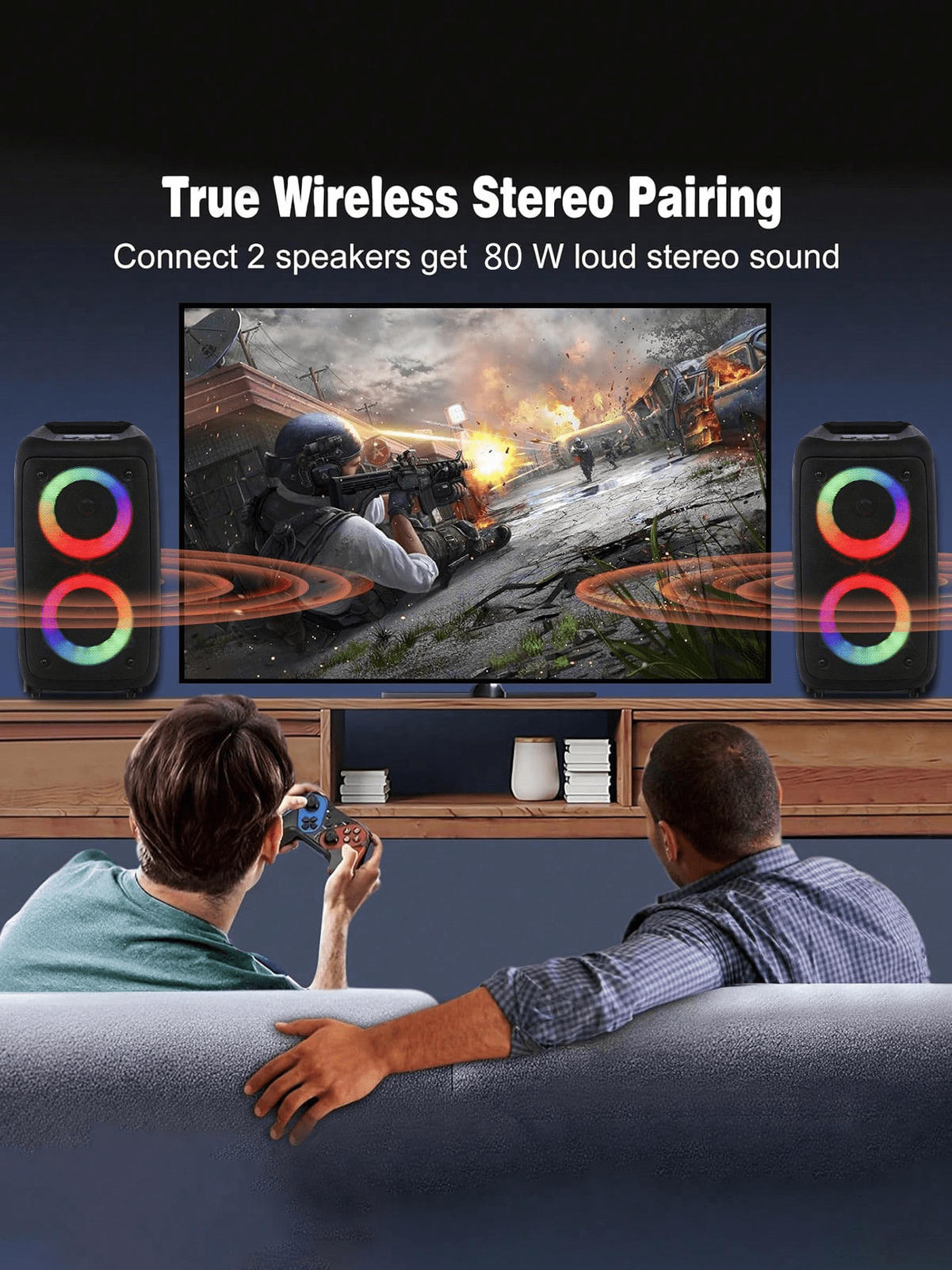 [Loud Bluetooth Speakers]The kinglucky Bluetooth Speakers is big powerful portable ABS speaker, it have 2 loud speakers ,can provide very heavy bass and amazing surround stereo sound. This Portable bluetooth speaker with subwoofer is very suitable for outdoor and indoor home party. it will bring you an unprecedented listening experience [Wireless and wired Connect]The kinglucky portable Speakers built-in advanced Bluetooth 5.0 wireless transmission, working distance up to 32ft range, easily connectable all Bluetooth-enabled device, such as you cellphone, tablet, laptop, and all other bluetooth devices. The speaker also can support wired connect to play. you can use AUX cable connect to your TV, computer, MP3, MP4, or other non-Bluetooth devices via 3.5mm audio jack. [Bluetooth speaker with lights] The kinglucky party speaker is designed with multiple dynamic light modes to light up every corner of the party space, and Colorful LED lights can change the lighting effect according to the rhythm of music, which colourful and vibrant can give your home party, beach, camping or outdoor travel an exciting atmospher. [Multi-function Party Speaker] The kinglucky portable bluetooth speaker support TWS, FM radio, TF Card music playback, AUX input, U-disk music playback, remote control and 6.35MM Microphone jack. It's built-in 2400mAh rechargeable battery, providing up to 3~5 hours play time ( depends on playing volume). You can enjoy the carnival whether it is an indoor or outdoor dance party. This big bluetooth speaker is great for camping trips, barbecues and even singing karaoke, weddings, conferences etc. [FM Radiol] The wireless speaker support FM radio Function, it can automatically search and save all available stations by long press pause button in FM mode . The top of this portable bluetooth speaker has a hand-held pull ring that you can take the speaker anywhere and a stand holder that can support the standing of mobile phones, tablets, etc. [TWS Features]The kinglucky bass speaker supports True Wireless Stereo (TWS) technology, you can pair two of our 3317 Bluetooth speakers together get powerful loud surround stereo sound for your party. [TWS Features]The kinglucky bass speaker supports True Wireless Stereo (TWS) technology, you can pair two of our 3317 Bluetooth speakers together get powerful loud surround stereo sound for your party. [Ideal as a holiday gift]Our kinglucky bluetooth speaker is a great gift for people of all ages, Whether they enjoy music, parties, or just want to enjoy high-quality music at home. This is a multifunctional and practical gift that anyone will love it. Ideal as a birthday gift, Christmas gift, and holiday gift.