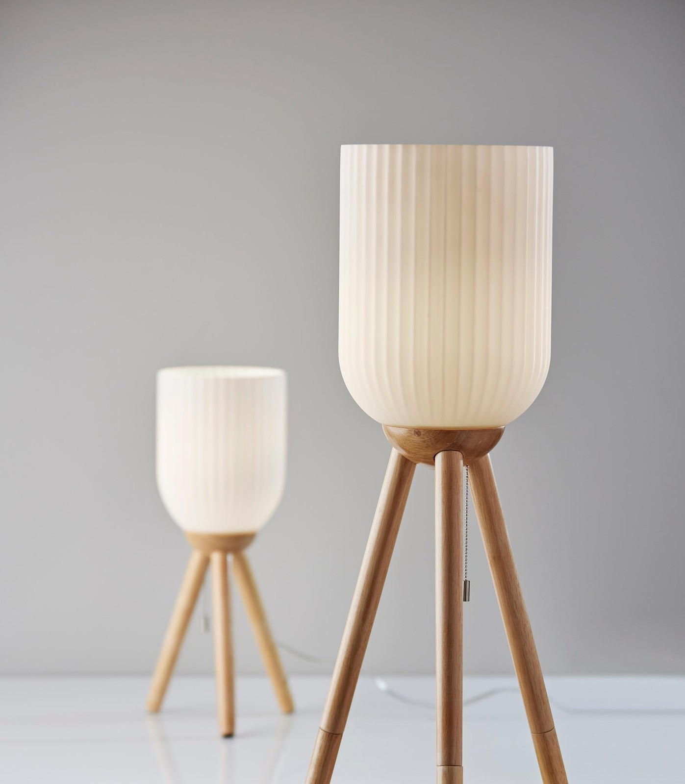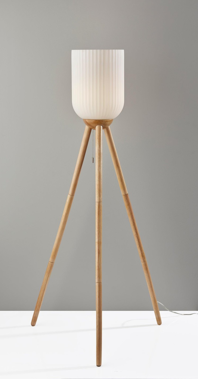 At 57.5" tall and with a 25" deep tripod base, the lamp is the perfect addition to room corners or beside furniture. The blend of different materials and geometries complements farmhouse and coastal styling. The frosted, ribbed glass shade produces softly diffused lighting. The lamp is operated by a pull chain switch. The Kinsley style is also available as a table lamp.