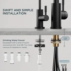 Product Name: Kitchen Faucet and Water Filter Faucet Combo 1. Perfect Match: Create an elegant transitional style and redefine the functionality of your kitchen with this faucet combo, featuring a kitchen faucet and a matching water filter faucet. 2. Made with lead-free stainless steel, the versatile kitchen faucet with a 3-function pull-down sprayer, which to switch from an aerated stream or spray for everyday cleaning. 3. The drinking water faucet demands and connects to a most of under-counter purification systems and filtration systems (Not included, Sold Separately). 4. The high-arc spout is perfect for filling glasses, pitchers, and reusable water bottles. 【Cost-Efficient Set】The Kitchen Faucet and Water Filter Faucet Combo is designed to complement any kitchen style while enhancing functionality. Made from lead-free stainless steel, the set includes a 3-function pull-down sprayer and a matching filter faucet that eliminates the need for bottled water, providing a value-added solution for any home 【Reassuring Material】The kitchen faucets are crafted from food-grade SUS 304 stainless steel and lead-free waterways prevent contaminants. The premium ceramic cartridge ensures long-lasting leak-free performance with over 500,000 cycles of testing 【Pull Down Kitchen Faucet】 This bar kitchen faucet with pull down sprayer offers three mode settings (Stream, Spray, Pause) for effortless rinsing and water control. Its 18 inch retractable hose and 360° rotating sprayer ensure efficient coverage of your sink 【Drinking Water Faucet】This non-air gap filter faucet is compatible with most under-counter Reverse Osmosis and filtration systems (not included). It offers easy installation and provides purified water anytime and encouraging healthier hydration 【Quick Setup】This bar sink faucet features quick-connect technology with a drop-in base for 1 or 3 holes. The water filter faucet includes two quick connector sizes (1/4" and 3/8") to accommodate various installation needs. Installation can be completed in under 30 minutes without professional assistance