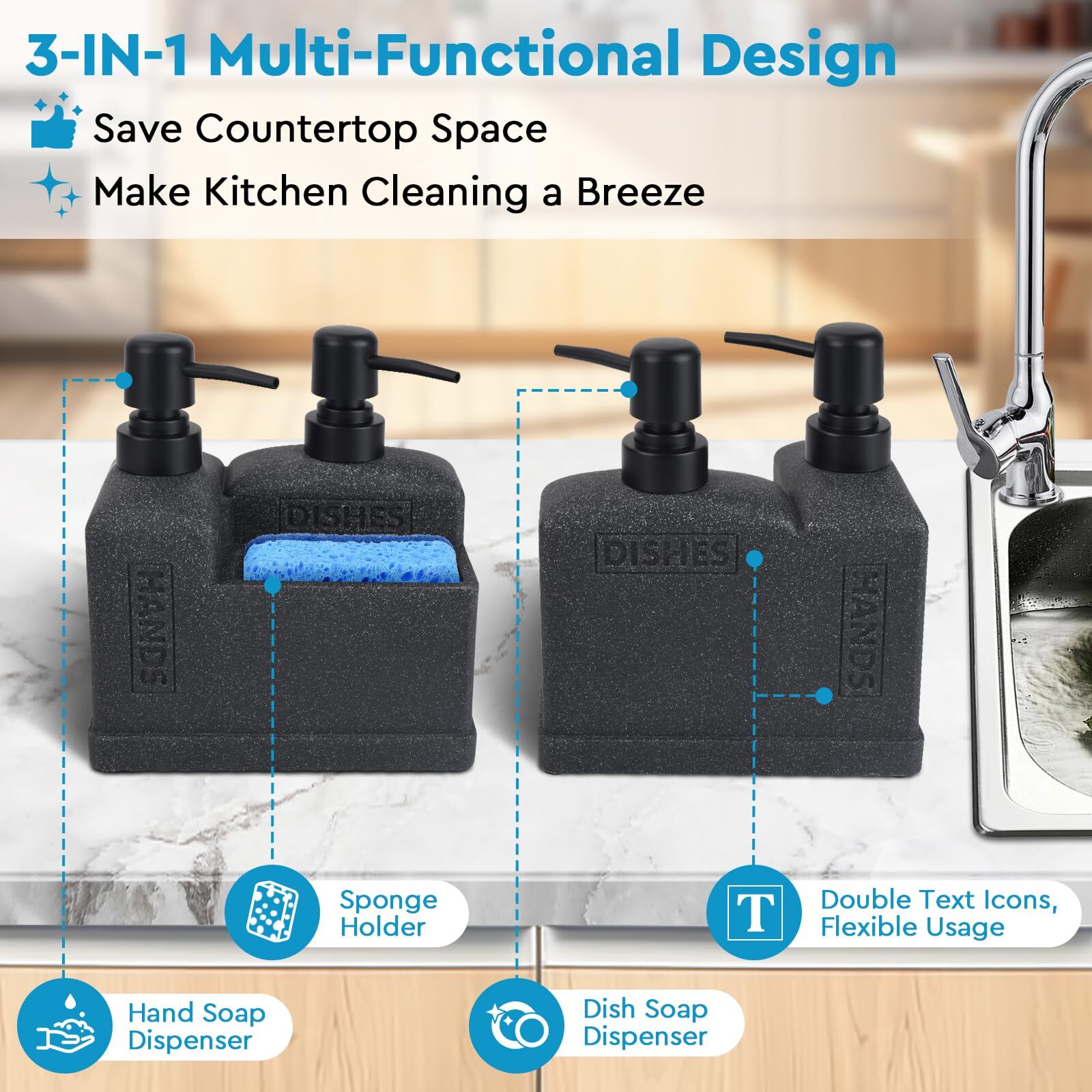Kitchen Soap Dispenser Set,Dish Soap Dispenser and Hand Soap Dispenser Set with Sponge Caddy 3-in-1 Kitchen Dual Soap Dispenser Set for Kitchen,Bathroom - Black ✅【Premium Polyresin】:Our kitchen soap dispenser set is made of nice resin,pretty thick & sturdy,has a nice weight,don't tip over,compared to plastic or glass,it won't break easily.And Corrosion and Rust Resistant,ensure longe used life. ✅【Dual-Pump Soap Dispenser】:The dish and hand soap dispenser set features a dual soap pump design,allow you store two different soaps,so you can effortlessly choose the soap you like.Meanwhile,each soap dispenser equipped with clear corresponding text icons on both sides for easy identification,you can use flexibly. ✅【Streamlined 3-IN-1 Multi-functional Design】:This soap dispenser for kitchen sink is simple and stylish design adding a clean touch for your kitchen,you can store hand soap,dishwashing liquid and sponge neatly in one place,save countetuop space and No more searching for cleaning supplies,make your kitchen life more efficiency. ✅【Versatile Dish Soap Dispenser】:The dish soap dispenser is versatile,it’s not only used for hand soap and dish soap,but also work great for lotion,shampoo,conditioner and more,the large compartment you can hold sponges,lipstick,necklace,earring,hair clips,rubber bands and other essentials,so this kitchen sink organizer is perfect for kitchen,bathroom,bedroom,apartment,hotel,farmhouse,ect. ✅【Perfect Gift】: Our soap dispenser with sponge holder is well-packed to ensure it is arrived safely without damage.Perfect gift for your family,mother,friends,lovers,birthday,thanksgiving day,housewarming or a wedding. ✅【100% Satisfaction Guarantee】:Thank you for choosing with Deobath.If you have any questions with this hand and dish soap dispenser set,kindly please feel free to contact us,we’ll provide you with a satisfactory solution within 24 hours,kindly please rest assured to purchase. SHIPPING Domestic Buyers - We have confidence in our products, but if you are not fully satisfied please contact us within 30 days of purchase and you will get full refund. - We ship within 3 business days of payment, usually sooner - We offer FREE shipping on all orders! - We only ship to the lower 48 states, no APO/FPO addresses or PO Boxes allowed International buyers – please note: Import duties, taxes, and charges aren't included in the item price or postage cost. These charges are the buyer's responsibility. - Please check with your country's customs office to determine what these additional costs will be prior to bidding or buying. * Order Cancellation Policy ** You can return a product for up to 30 days from the date you purchased it. 1. The seller reserves the right to cancel the special case only due to eBay cancellation fee. 2. The decision of seller is the final. 3. The seller will respond to the cancellation request within 2 business days. Please wait for the result of cancellation. 4. In case the cancellation is not completed by some reasons, the buyer can follow the options below to get the refund. 4.1 The buyer can reject the item when it arrives. 4.2 The buyer can send the item back to the seller within 30 days If the buyer receives item (USA Shipment ONLY). The seller will provide the FREE return label to the buyer when the buyer opens " Return Item" case on eBay by using the reason as "Change my mind" ONLY. 5. When buyer has placed the order. The order will be processed and completed by automatic warehouse system within 5 minutes. In case that buyer sends the cancellation request after 5 minutes of placing the order, the request will be rejected. **Sending direct message to cancel the order is not allowed for every case.* Return Policy For the return case - If buyer would like to return the items for refund or replacement, please CONTACT SELLER to receive the free return label from seller. The refund or replacement will be processed with the tracking number of return label which is provided by seller only. The other ways of return which are not approved by seller will not be processed for the refund or replacement.