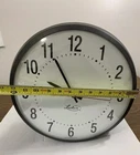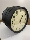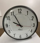 This Latham/American wall clock is a vintage piece that works perfectly. With a round shape and a black color, it is a great addition to any room. The clock is powered by electricity and has a quartz movement. Measuring 12 inches in length and height, and with a width of 12 inches, this wall clock is a perfect fit for any space. It features an analog display type, with a time recorder and a wall bracket for easy installation. The clock is made of glass, plastic, and metal materials, and has a matte finish. This Americana style clock is a great decorative collectible, with a time period of manufacture between 1960-1969. It is not antique, but has a vintage feel that adds character to any space. The clock is not signed, but is a great unit quantity of one. It is a perfect addition to any collection of wall clocks, and will add a touch of elegance to any room.