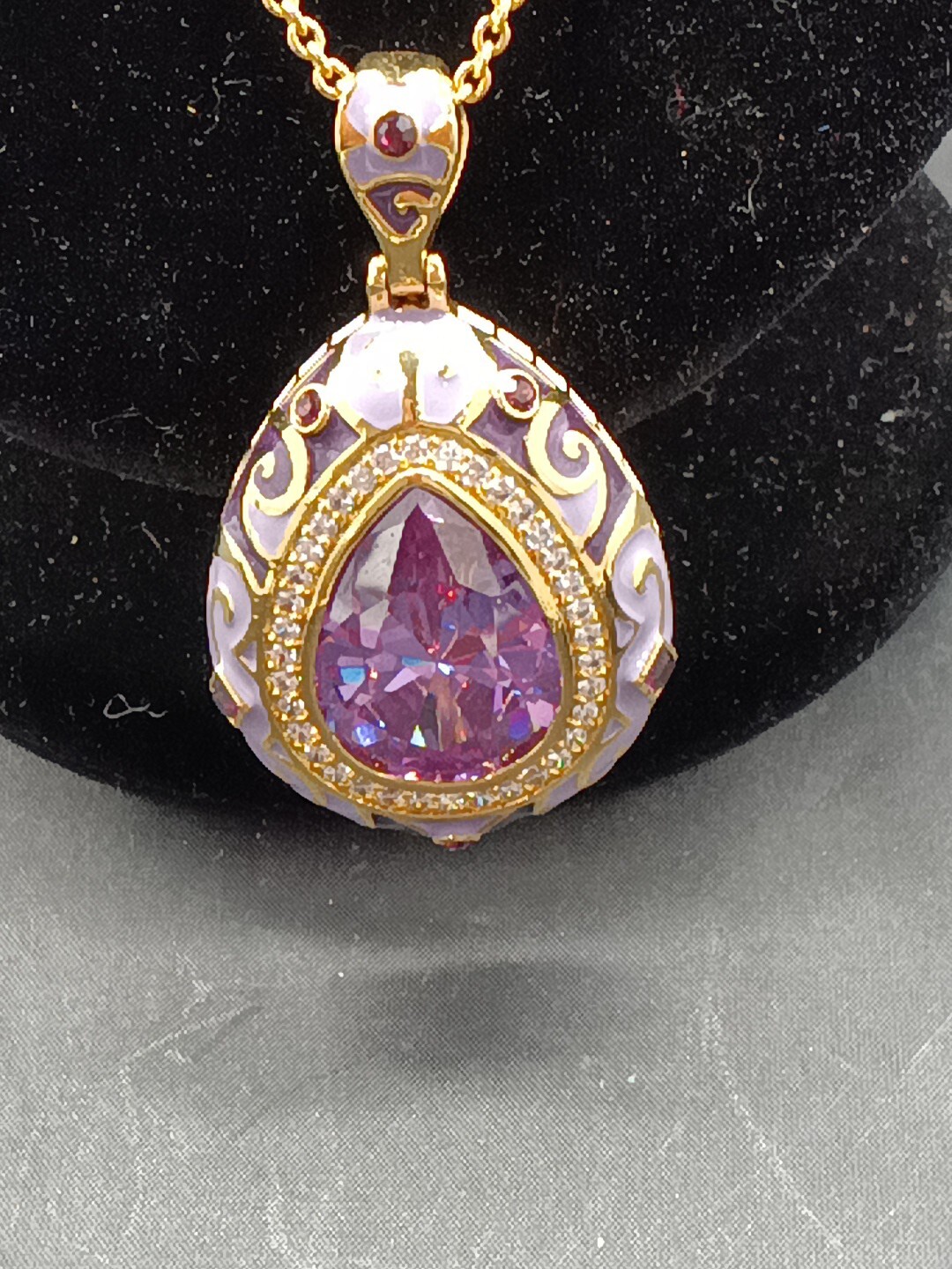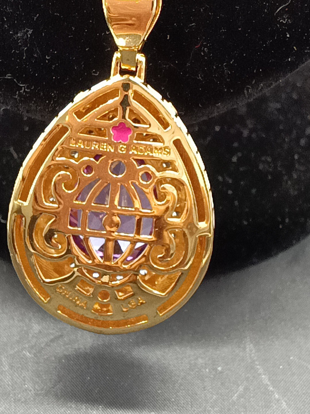 Add a touch of elegance to your outfit with this stunning Lauren G Adams oval pendant. Made with gold-tone, enamel, and 11.8mm crystal, this amulet pendant is perfect for anyone who loves vintage pieces. The pendant features a pear-shaped crystal in white/colorless and is designed in the US but made in China. The pendant is ideal for those who love beauty and want to add a unique touch to their jewelry collection. It comes from a trusted brand and is sure to become a beloved piece in your jewelry box. Part of the Elegant Drops collection, this pendant necklace is crafted of a solid brass base and plated with 18k gold. It features finely hand painted Purple enamel and cubic zirconia accents for a classic look.