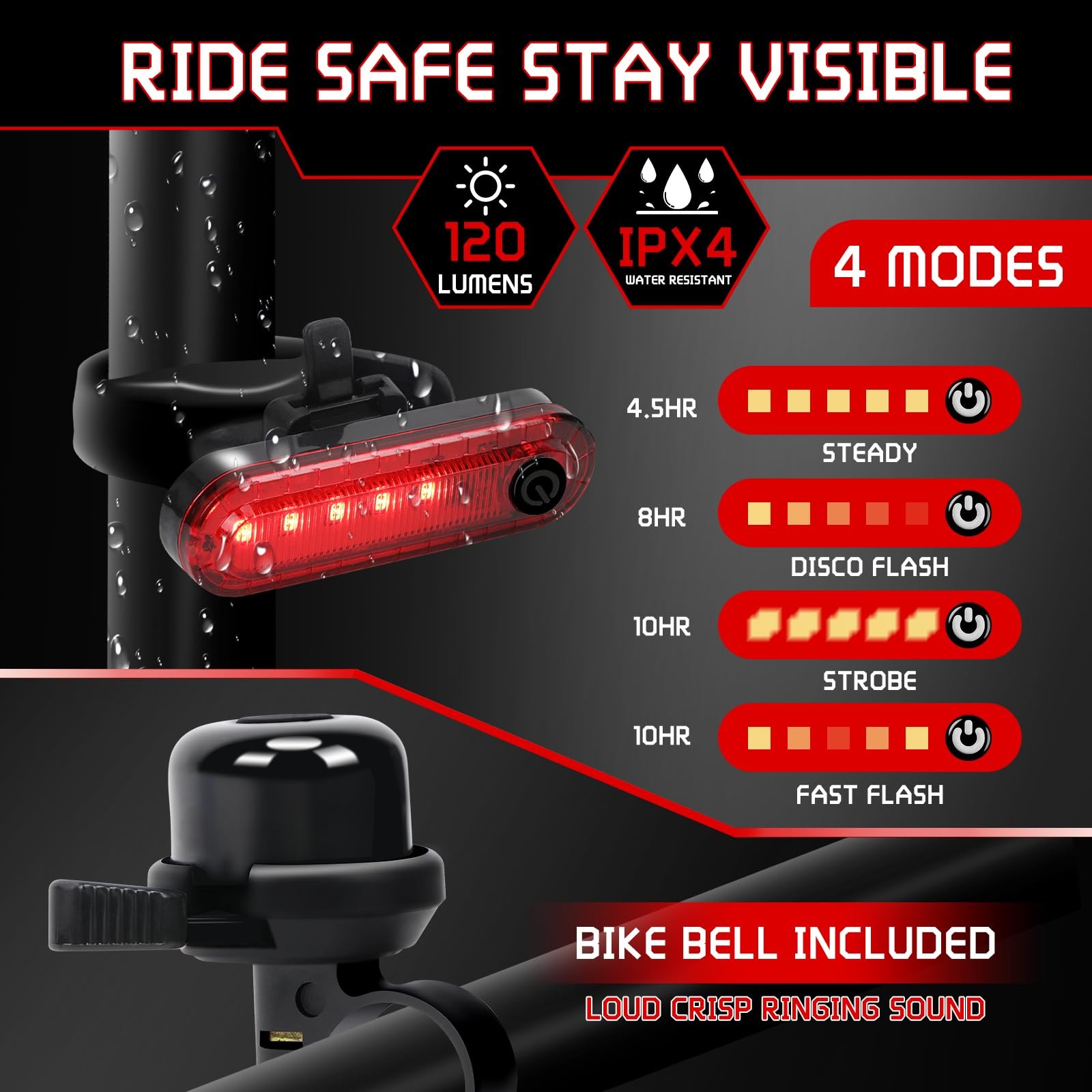 Our bicycle lights front and rear use high-brightness LED lamp beads, which can provide sufficient light, so that you will no longer be confused when riding at night, and meet your needs in different environments; the bike bell has a clear and pleasant sound, reminding passers-by, and is your right-hand man on your cycling journey. Product name: bike light set, bicycle bell Product material: aluminum alloy Product size: 4"L x 4"W x 1"H Product weight: 4 oz Product color: black Product quantity: 1x bike headlight, 1x bike tail light, 1x bicycle bell Features: 1. Set design, including bicycle headlight, rear bike light, bicycle bell. Easy to install, suitable for most bicycle models. Lightweight and durable, waterproof, fearless of wind and rain, escort your cycling journey. 2. Bike lights can according to your needs and environment, you can choose different light modes, with 6 front light modes and 4 rear light modes to adapt to various road conditions. 3. Rechargeable bicycle light use USB rechargeable design, easy to charge, LED digital screen can display the remaining power, so you can see clearly at any time, adding safety and convenience to your cycling journey. 【Super Bright & Long Runtime】: This bike lights uses 2 pcs 800 high lumen LED lights with a crisp bike bell, illuminating the road you ride at night. The running time of the headlight is 5-10 hours,and the running time of the taillight is 50-80 hours,which can meet your long time riding lighting needs. 【LED digital screen】: Rechargeable bike light is equipped with an LED digital screen, which can accurately and clearly display the remaining power, and is equipped with the latest USB-C charging technology, allowing you to quickly connect to a USB power source for easy charging. It is clearly visible at night and during the day, adding safety and convenience to your cycling journey. 【Easy to Install】: The bike light set has front bicycle light, rear bike light, and bicycle bell adopt a simple and firm installation method, which is suitable for most bicycle models, and can also be used for scooters, strollers and wheelchairs. And the bike lights for night riding light weight allows you to carry it anywhere anytime, and it can also be used as a normal flashlight. 【Excellent Quality】: This Bicycle light is made of premium quality aluminum alloy, and the IPX4 waterproof design can withstand bad weather, so you don't have to worry about windy and rainy weather and muddy roads when you go out, and bike lights front and back can provides you with a long service life, ensuring the stable operation of the bike accessories. 【Widely Use】: Bicycle lights front and rear has 6 different front light modes and the bike tail light has 4 modes . In addition to daily use installed on the bicycle, you can rely on this light in power outages, roadside repairs and safety emergencies. Bike headlight and tail light set is very suitable for use at home, walking the dog at night, camping, fishing. Bicycle light adapt to various road conditions and escort your cycling journey.