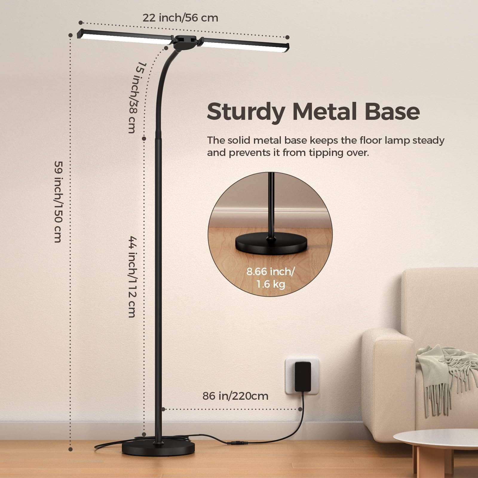 LED Floor Lamp for Living Room, Bright Reading Lamps for Office, Adjustable Colors Temperatures&Brightness, Dual Head Gooseneck Standing Lamp, Remote and Button Control,Eye-Caring Tall Lamp, Black Product Details Finish Type: Powder Coated Product Dimensions: 21.3"D x 8.5"W x 59"H Lamp Type: Floor Lamp Shade Color: White Shade Material: Polycarbonate Product Dimensions : 21.3 x 8.5 x 59 inches; 6.72 Pounds Item model number : V-FL-ST06 Batteries : 2 AAA batteries required. (included) Date First Available : July 3, 2025 Manufacturer : VrimNowit Customer Reviews: 4.8 4.8 out of 5 stars 96 ratings Finish Type: Powder Coated Product Dimensions: 21.3"D x 8.5"W x 59"H Lamp Type: Floor Lamp Shade Color: White Shade Material: Polycarbonate Switch Type: Button Brand: VrimNowit Color: Black Material: Aluminum, Metal, Plastic Included Components: Adapter, LED Floor Lamp, Remote Control, User Manual Number of Items: 1 Specific Uses For Product: Craft, Reading, Studying, Working Water Resistance Level: Not Water Resistant Model Name: V-FL-ST06 Manufacturer: VrimNowit Part Number: V-FL-ST06B Item Weight: 6.71 pounds Item model number: V-FL-ST06 Batteries: 2 AAA batteries required. (included) Finish types: Powder Coated Batteries Included?: Yes Batteries Required?: Yes Date First Available: July 3, 2025 Super Bright Dual-Head Design & Eye-Caring: Our LED floor lamp features an adjustable dual-head design that rotates up to 180, delivering brighter light and wider coverage than typical floor lamps. Easily switch between broad room illumination or focused task lighting for reading, work, and crafts. It emits soft, flicker-free light with reduced blue light for gentle, even brightness that significantly minimizes eye strain during extended use. Adjustable Color Temperature & Brightness: This dual-head standing lamp features 5 color temperatures (2700K6500K) and smooth stepless dimming from 10% to 100%, allowing you to create the perfect light for living room, bedroom or home office. Flicker-free technology delivers healthy, comfortable illumination, while the smart memory function automatically restores your last settings at startup. Remote and Button Control: Effortlessly manage your lamp from anywhere using the 50 ft-range remote, which works through obstaclesset timers and modes without leaving your sofa or bed. The magnetic remote securely attaches to metal poles to prevent loss. Alternatively, you can adjust the lighting mode using the buttons on the lamp head. 360 Flexible Gooseneck: Direct light precisely where you need it with the long, adjustable neck. Designed to meet the lighting needs of various detailed and delicate tasks, it ensures clarity and comfort for every activity. Built on a sturdy, weighted base, it stands firm and stable while delivering excellent, bright illuminationperfect for bedrooms, living rooms, nurseries, home offices, and studies. Easy to Install: No tools are requiredsimply twist the lamp poles together and screw them into the base to complete the setup. The entire process takes less than 10 minutes. If you have any questions during installation, our customer service team is always ready to assist you.