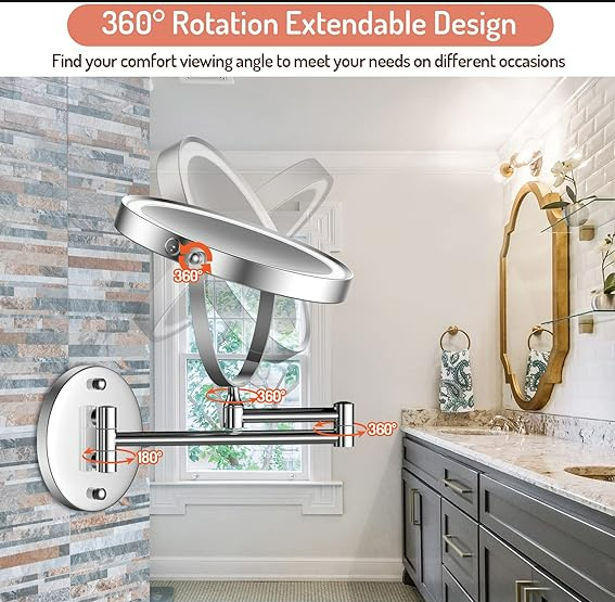 Rechargeable Wall-Mounted, Double-Sided Lighted Makeup Mirror with 1X/7X Magnification from Rocollos The mirror has a chrome finish and measures about 8" in diameter. It is in new, open-box condition, and the original box will not be included. FEATURES: Rechargeable - This mirror has a built-in 1500 mAh rechargeable lithium battery, and a type C cable is included. It plugs into a USB port; a separate adapter (not included) will be needed if you wish to plug it into a regular wall outlet. 3-Color Lighting and Dimmable - Offers cool light, warm light, and natural light. Just press a sensor on the mirror to change the light, and press & hold to dim it. Magnification - 1X high-definition mirror on one side, 7X magnification on the other. Extendable Arm and 360-degree swivel - The arm extends out 13 inches, and the mirror swivels to any angle you need. The mirror can be folded flat against the wall when not in use. Easy Installation - Installation instructions and hardware are included. The package includes a spare set of screws and anchors that could be used for another project. Indicator Lights - A red light indicates that the mirror battery is charging; a green light indicates that it is fully charged. Automatic Shut-off - The LED light may be manually switched off, or it will automatically turn off after 30 minutes. Colors may vary slightly from how they appear on your screen. SHIPPING: We ship all items within 2 business days of your payment clearing (excluding holidays and weekends). RETURNS: We accept any item back within 30 days of the original purchase date for a full refund (cost of item plus original shipping). Return shipping is covered by buyer. FEEDBACK: If you are happy with your purchase, please take a minute to leave feedback. If you have issues with your purchase, please message us through eBay to resolve the issue so that we can earn your positive 5-star feedback. Thank you!