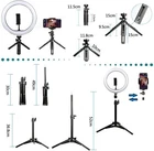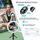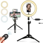 LED Ring Light with Two Tripod Adjustable and Phone Holder, 10” Dimmable Circle Selfie Ring Light Kit Camera Remote Shutter for Live Stream/Makeup/YouTube Video/Vlogging - iPhone/Android Description 【Soft and Adjustable Lighting】 The 10” ring light is equipped with 170 LED light sources that are gentle for the eyes. You have control over 10 dim levels ranging from 2800K to 7200K. Since there are 3 light modes to choose from, not only are you able to select the light mode freely but you also can regulate the brightness. Both the mobile phone and lamp holder of the ring light is fully adjustable in 360° which can meet all your fill light requirements of each angle. 【Two Tripods, Freely Combinable】Comes with two quality tripods can be adjusted from 16.5 to 50cm lengthwise. Combined with the ring light it’s adjustable up to 81cm. Not only can it be used on the table for live broadcasting, but also be placed securely on the floor for lighting. Both tripods have non-slip rubber feet at the bottom, so don’t be concerned about scratching your tabletop. The tripod can be compatible with other digital devices (such as SLR, digital cameras and GoPro cameras). 【USB-powered, Bluetooth Remote Control】 Given the convenient USB-powered type, there is no need to worry about insufficient power supply. Use it with a power bank, USB charger, computer, laptop and other equipment to get power from. Additionally, you’ll get a Bluetooth remote control with which you can use the ring light even at a distance. It’s compatible with IOS/Android smartphone systems and has a maximum operating distance of 10m. This makes shooting photos/videos much more convenient. 【Wide Range of Application】Since it’s a 360° adjustable ball head you can adjust the angle at any time as you see fit. The flexible ball head gives free adjustability to the phone’s angle. The ring light provides excellent natural light and a wide range of lighting options, easily matching that of various shooting environments. Whether outdoors or indoors, live streaming, shooting short videos or lighting a portrait photography session etc. always meet your lighting needs. 【Rich in Accessories & Worry-free Guarantee】 Package includes: 1*10” LED light, 2*tripods, 2*smartphone holder, 1*Bluetooth remote control, 1*small ball head. Reasons to choose ring light: Clearly present your beauty in photos, videos, live streaming . The 170 LED light sources inside the sturdy ring-shaped acrylic lampshade emits soft light that not only improves the brightness on impact but also makes your skin more translucent and produces that starlight in your eyes. 30 lighting modes - cool white, warm colored and yellow warm 3 lighting modes, each of which has 10 brightness levels ranging from 2800k to 7200k . Long press the brightness adjustment key for infinite selection. Powered via USB interface port - Power banks, laptop, USB adapter all can act as a charging station; power supply is no longer a concern when you want to use it. Shoot TikTok videos on your own - we’ve provided you with a Bluetooth remote as a gift that can be used with IOS and Android smartphone systems. Singlehandedly take photos and videos anytime, anywhere. High color rendering LED - improve photography texture ’s ring lights have LEDs with a CRI of ≥80 so they represent very closely the natural light, thus restoring the original colors of people and objects within the camera. The color temperature of the ring light is adjustable from 2800k to 7200k. As such, it can be adjusted from warm color (warm white) → mixed → natural white (day white). Using special LED SMD designs, compared to common ring lights, the improvement in brightness rang is larger and the power consumption is much lower. When the ring light is turned on, all facial features illuminated by the light have no shadows, which not only improves the brightness but also lets you feel the translucency of the skin, further enhancing the picture’s texture. Dimmable LED ring light ’s ring light provides three distinctive colors of white, warm and warm yellow. Depending on different environment and photography requisites you can choose the color of the light in relation to your skin color or to showcase an effect. Each light has 10 adjustment levels which can be regulated to fit the place of use and your favorite style. Coordinated with the surrounding environment you’ll be able to create a suitable atmosphere. A must for video and content creators Use it as a fill light or live light for YouTube videos. Unlike other LED ring lights, this one is equipped with 170 LED light sources that makes the colors more vivid, the light changes pop more, create atmosphere, change to a different style, and stimulate your creativity for shooting on Facebook, YouTube or TikTok. The power cord is 195 cm long and can be plugged in anywhere. Whether outside or inside, live streaming, recording short videos or lighting a portrait photograph, etc. always meet your lighting needs. Multiple uses - 360 degree adjustability There are 2 tripod brackets, which can meet your different needs. The easy-to-adjust lighting accessory was developed taking into account the many situations in life: As it is a 360 ° adjustable ball head, you can easily adjust mobile phones and other devices to the angle you want. The ring light provides excellent natural light and a wide range of lighting options that easily match those of various shooting environments Long distance shooting is a non-issue - Bluetooth Controller With the Bluetooth remote you easily take pictures and videos. The power cord is 195cm long, use it anywhere. The excellent lighting functionality and ease of use of this ring light make it a widely used tool in shooting photos, online streaming, video chats, taking selfies in concerts or other occasions. How to use the Bluetooth remote: 1. Press the [On] button to turn it on. 2. Turn your phone’s Bluetooth on, select and co