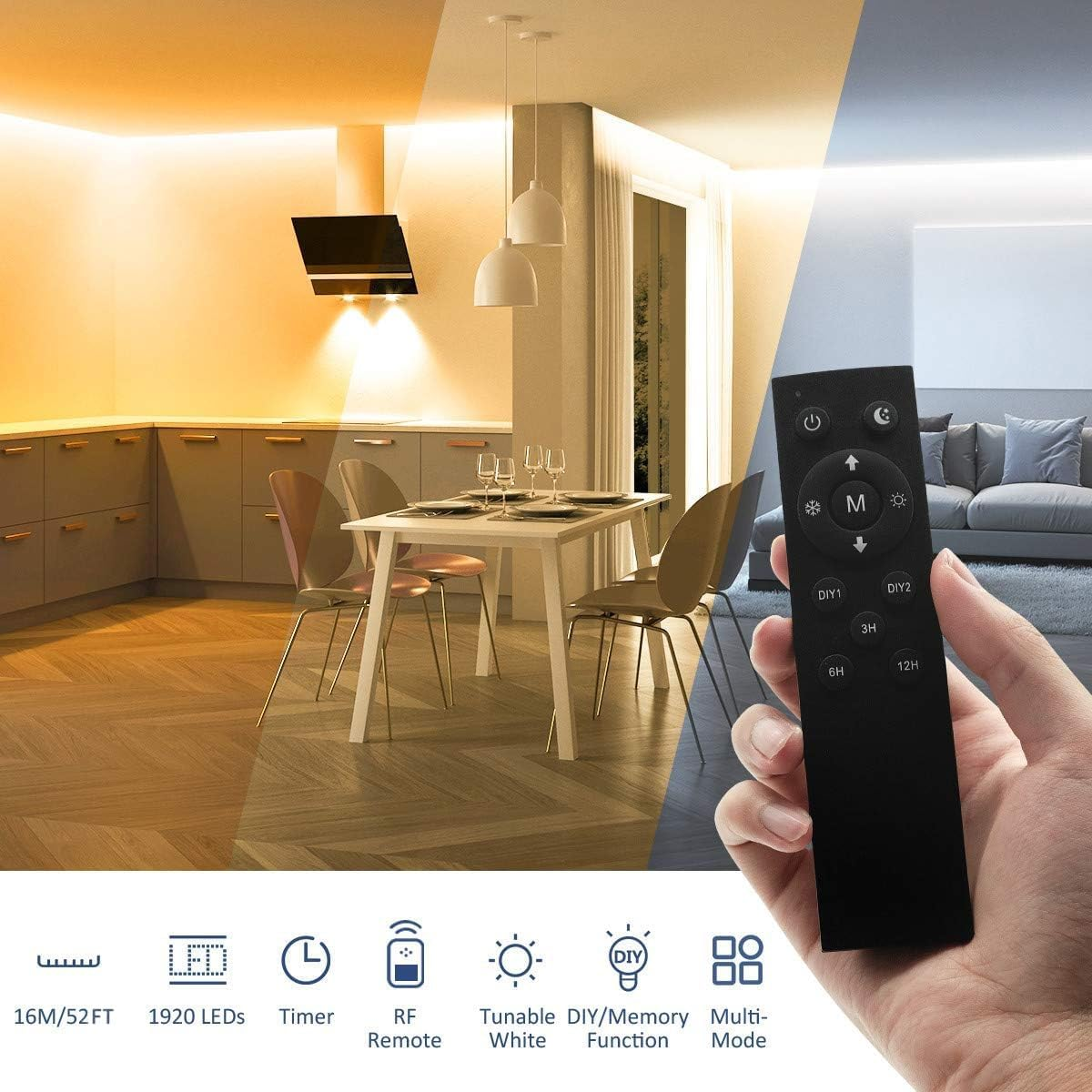 Store New Arrivals Add to Favorite View Feedback Contact LED Strip Lights White 52.5Ft 24V Dimmable 3000K-6000K LED Tape Rope Light with Remote Flexible 2835 LED Ribbon for Kitchen under Cabinet Mirror Room Indoor Home Daylight Warm White Description Item model number ULS-A Light Source Type LED Style decoration/home/bedroom/livingroom/kitchen Number of Items 1 Power Source Corded Electric Number of Light Sources 2835 Control Method Remote Theme Movie, Music, Neon, Christmas Tunable White LED Strip Lights, Fantasy, Halloween Batteries Included? No Assembled Height 0.1 inches Controller Type Remote Control Batteries Required? No Wireless Communication Technology Radio Frequency Product Dimensions 624 x 0.4 x 0.1 inches Material SMD/1920 LEDs Assembled Width 0.4 inches Seasons All Seasons Number of Batteries AAA batteries required. Included Components RF Remote*1, User Manual*1, Power Adapter*1, Controller*1, 26FT LED Strip Lights*2 Item dimensions L x W x H 624 x 0.4 x 0.1 inches Bulb Features Dimmable Indoor/Outdoor Usage Indoor Material Type SMD/1920 LEDs Light Color White Water Resistance Level Not Water Resistant Item Weight 10.9 ounces Connectivity Technology Radio Frequency Occasion Christmas, Bedroom, Father's Day, Congratulations, Birthday Special Features Adjustable Special Feature Adjustable Part Number ULS-A Color Temperature 6000 Kelvin Color White Wattage 36 watts Batteries AAA batteries required. Voltage 12 Volts Plug Format US Style Assembled Length 52 Feet Luminous Flux 2750 Lumen Size 52FT 24V Safe White LED Strip & Long Life: Low heat generation and low voltage of 24V. The tunable white led strip 26ft*2 is touchable and without danger. The dimmable LED strip lights of 52ft is UL & FCC listed for safety and quality assurance. The power supply is UL certified and thus guarantees a long service life. Please as soon as possible if you have any problems with the item. We will find the best solution for you within 24 hours. Dimmable White LED Strip & Multimode: The color temperature for the led strip lights is adjustable from 3000K-6500K (a total of 10 levels). You can flexibly switch between warm white, daylight and cold white. There are separate buttons to control multiple modes. Timer & extra DIY Buttons with memory function. Super Bright & Dimmable: Ustarus light strip 24v adopts new 2835 LEDs as conventional 3528 LEDs, guarantees higher brightness, nicer light, better heat dissipation. 1920 LEDs that can be dimmed from 10% to 100% provide you with sufficient light power from 10 levels of brightness. Please kindly note that you cannot dim the light without a remote. Easy Installation & can be shortened: Please clean the wall and keep the wall dry before installing the led strip lights so that the led tape could be adhesive to the walls. Multiple functions are adjustable by one button, easy to use. The LED tape can be cut at the marked points. Please search for “2835 4 pin connector” for a re-link. Practical 360 ° RF Remote Control: RF can control longer distance (up to 15M) than IR. It can also penetrate an obstacle. You can control the white led strip in every corner of the room. One Ustarus remote control connects to only one LED strip. Ustarus led strip lights is compatible with smart plug. Product Description • Ustarus is a company that focuses its activities on getting involved in the field of lighting for houses. • We are committed to creating excellent lighting for global families through constant innovation, dedicated work and excellent products. Why 52FT Ustarus LED light strips? When you need 50ft led strips • Voltage is only DC 24V. Thanks to the excellent heat dissipation, the LED light strip can be touched. There is no danger! • You can use the white led strip in cars safely. • No lead or mercury, no UV or IR radiation. • Adopted high quality LED 2835 with low heat generation ensures long life up to 50,000 hours. • 10 Brightness & 11 color temperature 100% security & non-toxic Durable Flexible operation Easy handling Warm white + natural white + daylight + cold white Widely used in hotel, kitchen, living room, architectural decoration, security and emergency lighting. Shortable & Foldable Please shorten the 2835 led strip directly along the marks. The thickness of the white led tape is about 0.4mm. This is convenient for you to bend the light strip at will at the corner. Connetor & Extension Wire Please search for “2835 4 pin connector” as keywords for the re-link. All extension wires suitable for 10mm, 4 pin connectors can be used for connection. 4 Steps to Install 1. Clean the surface; 2. Remove the adhesive; 3. Paste and press for 10 seconds; 4. Turn on the led strip lights. Package Inhalt 2X 26ft Dimmable White LED strips; 1X Upgraded RF remote controller, 1X ETL Listed power adaptor; 1X Controller Cable, 1 x User Manual Specification: Wattage: Max. 32W; LED Quantity: 1920 LEDs Color Temperature: 3000-6500k adjustable Color: warm white, daylight white, cool white Working Voltage: 24V; Protection Rating: IP20 Length: 16m/52ft; LED Type: 2835 Versatile Application You can decorate and light up your kitchen, living room, bedroom, TV background, mirror, door, wall, stairs, ceiling, cabinet, etc. Used to create a warm atmosphere and environment (wedding, birthday, party, bar) during the festival. Interior lighting Ideal for illuminating kitchens, cosmetic mirrors, dining tables, bays, benches, shelves or wardrobes or for commercial applications. Wherever you have a port, you have brilliant LED lighting in your home. Decoration Decorate your bedroom so that you have a restful and relaxed environment. The number of possible uses of the LED light strip is only limited by your imagination. DIY LED light strips are flexible and can be bent into any desired shape. Let your imagination run wild and create your own fairy lights. (Attention: Children must be accompanied by adults) The remote controller can control either one or many strips accordi