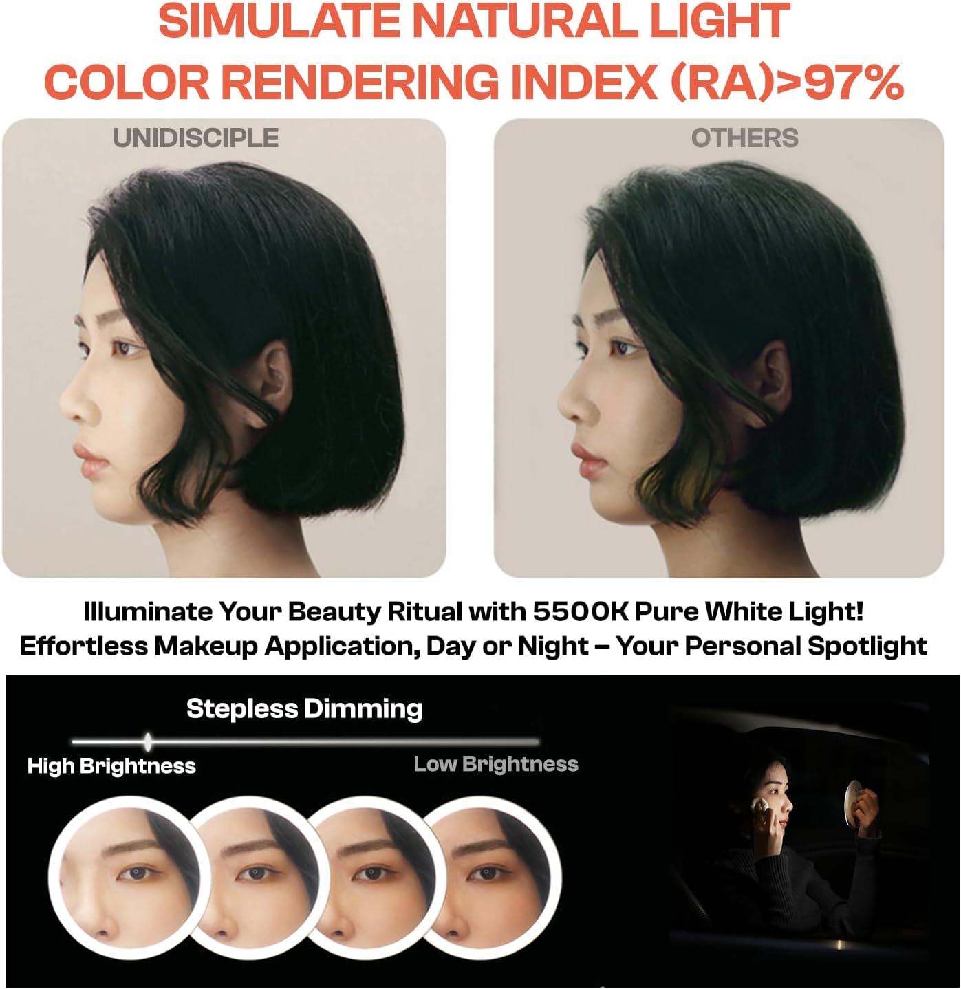 Handheld Rechargeable Travel Makeup Mirror with LED Light Compact Portable Description [TYPE-C Rechargeable LED Light Makeup Mirror]The innovative Type-C Rechargeable LED Lighted Travel Mirror with a built-in 800mAh battery.It takes about 2 hours to fully charge, and the usage time is about 2 hours at high brightness and about 11 hours at low brightness. [The Compact Mirror That Goes Everywhere] At just 4.5" x 4.5" x 1.5" and a featherweight 106g, this mini lighted mirror slips easily into even the smallest bag. Yet it provides a generously-sized viewing area for seamless touch-ups on-the-go.Whether you're rushing out the door, refreshing your makeup at the office, or primping before a night out, this travel-ready mirror ensures you're always put together. [Dimmable Makeup Mirror - The Lighted Mirror That Brightens Every Look] Our mirror uses bright, color-rendering 5200K daylight LEDs with an impressive CRI of 97+. This ensures even, true-to-life lighting that allows you to see every detail with crystal clarity.But we didn't stop there. The mirror's dimming function lets you adjust the brightness with infinite levels. Go full blast for precision makeup in low light, or dim it down for a soft, flattering glow. [The Travel Mirror That Stays Securely Closed]Avoid the hassle of your lighted mirror accidentally turning on and draining the battery during trips. The innovative Travel Lock feature on the UNIDISPLE Lighted Travel Mirror keeps it safely powered off until you're ready to use it.To activate the travel lock, simply long-press the power button while the mirror is off. It will remain locked, preventing any accidental activation, until you long-press again to unlock. [The Ergonomic Handheld Mirror for Effortless Primping] The key is the unique silicone ball grip on the back. Crafted using ergonomic principles, this contoured handle fits perfectly in your palm for a non-slip, strain-free grasp.Whether you're meticulously applying makeup or just checking your look, the balanced weight and soft texture allow you to hold the mirror with ease for as long as needed. No more cramped hands or tired arms! Product Description The video showcases the product in use. The video guides you through product setup. The video compares multiple products. The video shows the product being unpacked. Beauty on the Go UNIDISCIPLE Handheld Rechargeable Travel Makeup Mirror with LED Light Crystal-Clear Reflection · 5500K Simulate Natural Daylight Ergonomic Design · Portable · Handheld Stepless Dimming · Constant Brightness 800mAh Battery · Long Using Life Crystal-Clear Reflection Portable LED Makeup Mirror - Perfect companion for flawless beauty on the go! Perfect for busy professionals, travel enthusiasts, and beauty lovers alike. Effortless Beauty at Your Fingertips! Innovative Ergonomic Silicone Ball Grip for your makeup mirror! Designed for Comfort: Our ergonomically shaped silicone ball fits perfectly in your hand. Secure Hold: Easily grip your mirror without strain or slippage. Quick Access: Grab and go with unparalleled convenience. Fatigue-Free: Say goodbye to hand cramps during long makeup sessions. Greater than 97% daylight similarity Sunlight in Your Hands: Flawless Makeup Anywhere, Anytime! Simulating natural light sources, the lamp boasts a Color Rendering Index (CRI) greater than 97, providing natural and true-to-life lighting that ensures accurate color reproduction and a naturally radiant makeup look. Long Battery Life + High Brightness 800mAh Battery + Constant Brightness LED Chip High Brightness 2 hours Battery Life Low Brightness 11 hours Battery Life UNIDISCIPLE is more authentic and brighter 5500k Pure White Light With Infinite Dimming for On-the-Go Glam! Meet the needs of multiple scenarios Easily fits into a backpack Suitable for travel, business trip, outdoor, office Makeup mirror for touch-up in the car Touch up your makeup anytime in low light Shipping and Return policies We offer a 30-day return/exchange policy for our products. You can choose a refund or exchange if you are dissatisfied for any reason with your product. All items ship from a US-based warehouse Shipping is always FREE. If you have any issues or you unsatisfied with your order, don't hesitate to get in touch with us before opening a case or leaving negative feedback. We promise to give you a solution ASAP. ♥Kindly note:♥: If you would like to order more quantity than shown is available, you are welcome to place one order for the maximum, and Place the order again because we always have more than shown in available items. Handheld Rechargeable Travel Makeup Mirror with LED Light Compact Portable
