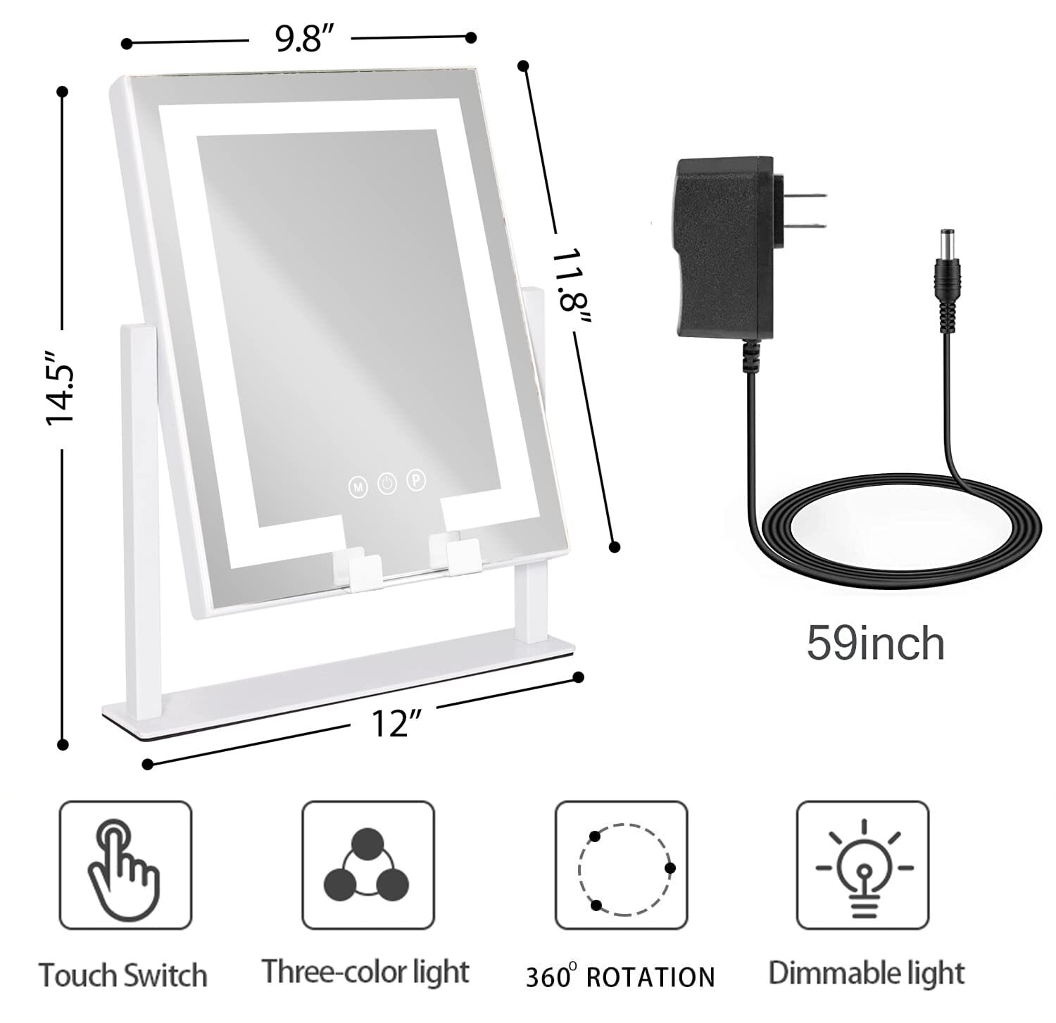Kottova Makeup Mirror with Lights,9.8 x 11.8 ” Vanity Lighted up Mirror,3 Color Modes,Touch Control, Detachable 10X Magnification Mirror, Metal Frame,360°Rotation,Plug in,White Item Description About this item 【3 Colors Lighting & High Quality】Makeup mirror has 3 colors lighting modes. Short press to "M" to change the light color: warm color/ natural color/ cool color,protecting your eyes 【Ajustable Brightness】-Makeup mirror is controlled by dimmable sensitive smart touch buttons. The Tabletop makeup mirror can be brightened or dimmed to meet your needs. Long press to "P" to adjust the brightness 【Detachable 10x Magnification】 -Makeup mirror besides the square 1X magnified mirror for comprehensive checked of gorgeous makeup, a removable round mirror with 10X magnification is included.Ideals for applying the makeup carefully,for example, doing eye brush, shaving, wearing eye contact lenses, etc.also can be carried in your handbag to touch up makeup easily when you are out 【Phone Holder】 - Makeup mirror features a phone holder for you to watch TV series and makeup tutorials while you do makeup, saving your time on a busy morning. 【360 Degree Swiveling】-360° free rotation,this Hollywood vanity mirror for vanity can adjust its reflection angle as needed,giving you a perfect viewing angle. 【Environmental Friendly Mirror】This makeup mirror is made of environmental friendly mirror, which is a high-transmittance glass. This glass is not easy to rust, and much clearer than ordinary mirrors. › See more product details This Hollywood Vanity Makeup Mirror simulates natural sunlight, illuminating your face more clearly and better grasping the degree of shade, 3 Kinds of adjustable brightness lights - daylight, cool white, warm white - to help you achieve flawless professional makeup no matter the weather outside. This vanity mirror, equipped with 10X magnification, ensures clear visibility for precise makeup application. Maintain a viewing distance of approximately 2.5-3.2 inches to prevent dizziness and distortion. Our Hollywood Light Up Mirror is the perfect bathroom accessory for teenage girls, makeup artists, and virtual stars/influencers. The phone cradle at the base is perfect for watching tutorials or recording your own video masterpiece. Payment Fast and Free shipping Shipping safe payment via eBay . Return 30 Day's returns