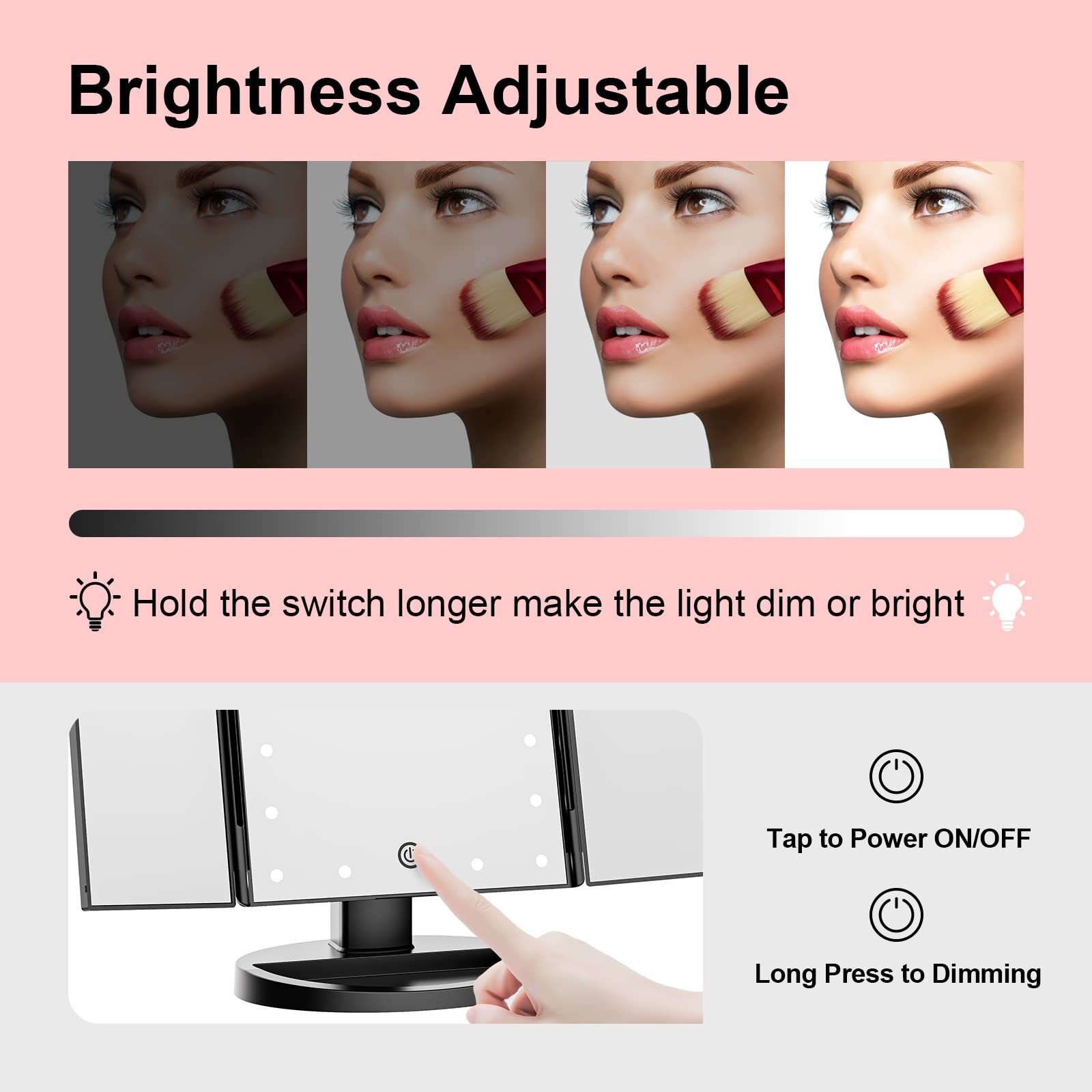 【21 Bright LED Bulbs】This make up mirror has built-in 21 LED lights, which are bright but not dazzling, great for makeup in dark or poorly lit areas, The base groove can accommodate jewelry and cosmetics. 【2X,3X,10X Magnification Modes】This led mirror comes with 2X and 3X magnifying mirrors, which can clearly focus on details to see your face clearly and create perfect makeup. The attached detachable 10X magnifying mirror is very suitable for applying eyeliner and mascara, modifying eyebrows, etc. 【180° Rotation & Tri-fold Design】You can fix the lighted makeup mirror at any angle you want, and the tri-fold design is convenient to fold when not in use to prevent dust or scratches. The detachable base of the personal mirror is convenient for travel. 【Dual Power Supply】This vanity mirror works with 4 AAA batteries (not included) or a USB cable (included), the desk mirror can't electricity by itself,and the brightness can be adjusted intelligently through the touch-sensitive switch. 【Ideal Gift for Women】When folded, the beauty mirror adorns your dresser with leather-like texture for an elegant and stylish look. Perfect gift for wife, mom, girlfriend, sister, etc. on Valentine's Day, Christmas gift, Mother's Day and other special days.