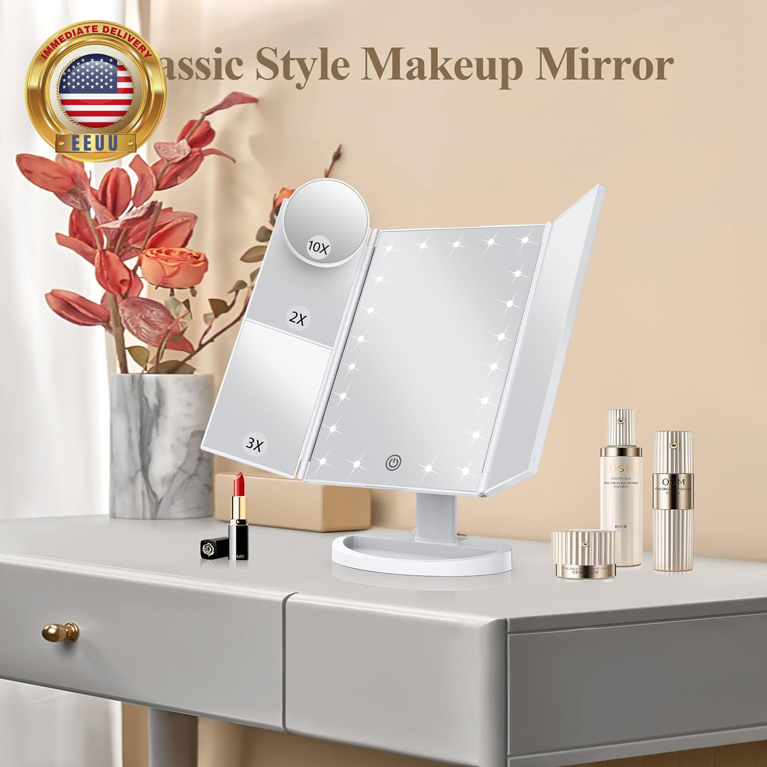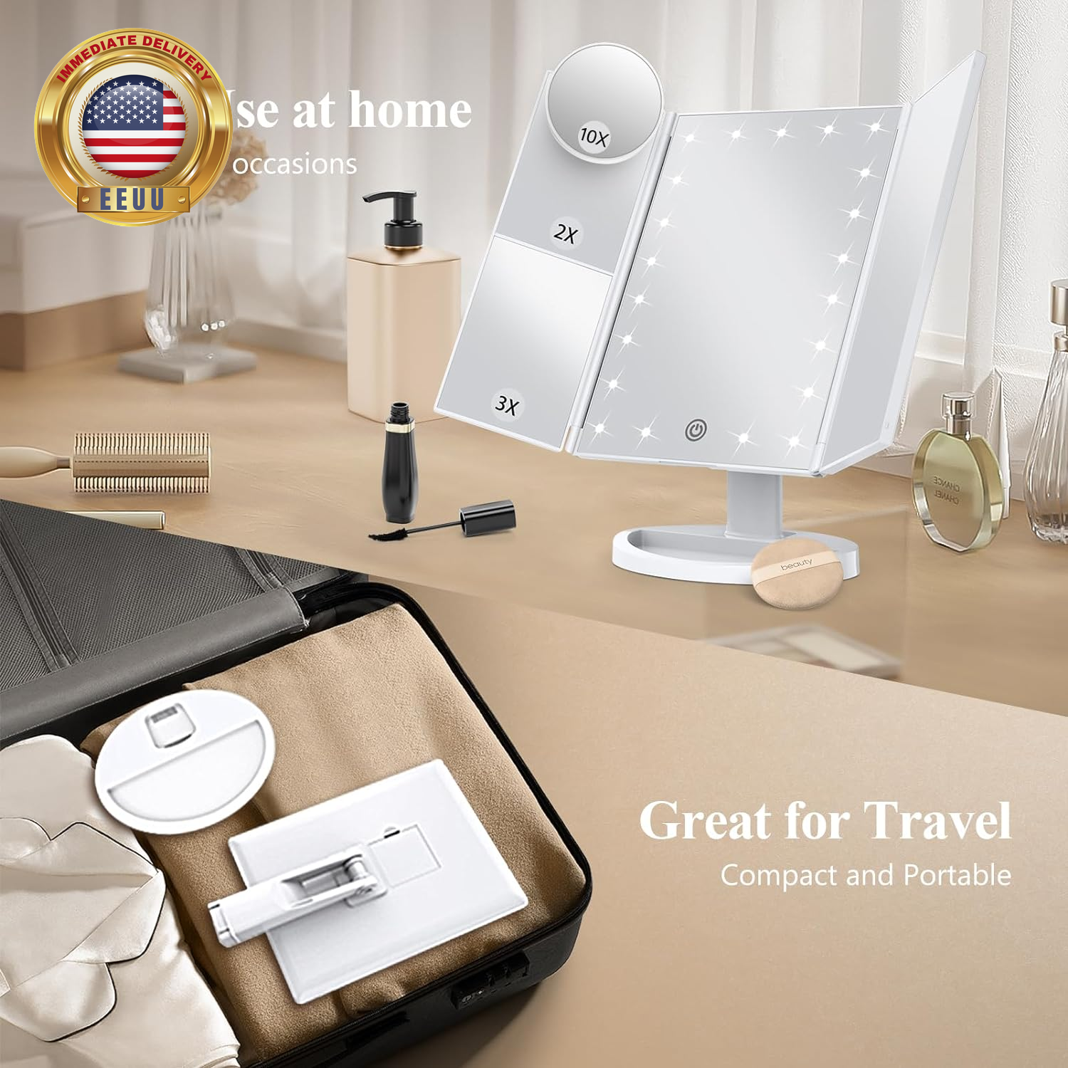 Store New Arrivals Add to Favorite View Feedback Contact Makeup Mirror Vanity Mirror with Lights, 2X 3X 10X Magnification, Lighted Makeup Mirror, Touch Control, Trifold Makeup Mirror, Dual Power Supply, Portable LED Makeup Mirror, Women Gift (White) ⭐️⭐️⭐️⭐️⭐️ Description Item model number SM241D-DL Style Classic Number of Items 1 Country of Origin China Magnification Maximum 1 Theme Christmas Frame Color White Number of Pieces 1 Room Type Bathroom Assembly Required No Material Acrylonitrile Butadiene Styrene Frame Material Acrylonitrile Butadiene Styrene (ABS) Finish Type Mirror Finish Specific Uses For Product Makeup Item Weight 1 pounds Surface Recommendation Glass Special Feature Adjustable Frame Size 2.8 inches x 7.5 inches Mounting Type Dresser Mount Color White Shape Rectangular Frame Type Framed Product Dimensions 9.4"L x 13.3"W Size 9.4"L x 13.3"W Built in 21 LED bulbs; HUONUL makeup mirror provides a good brightness for makeup; dim or brighten up the lights with a long pressing of touch screen switch 10X,3X,2X magnification modes; lighted makeup mirror has 3 panels magnifying and wide-angle viewing; see clearly your face and make a flawless makeup, suitable for desk makeup and handheld use. Note that the main mirror does not have 10X magnification Dual power supply; makeup mirror with lights powered by USB charging cable or 4xAAA batteries; USB cable included, Charger and batteries not included Adjustable degree rotation & touch control; adjust the mirror as per the suitable viewing angle you wish, easy and convenient touch switch, easily control the LED makeup mirror when doing makeup Top gift for women; birthday gift, Valentine's Day gift, Mother’s Day gifts, Christmas gifts for teen girls, family, wife, or girlfriend, or another special day gift; Customer first; we can help if you have any issues with your purchase Product Description The video showcases the product in use. The video guides you through product setup. The video compares multiple products. The video shows the product being unpacked. Can this makeup mirror be charged? The mirror itself can't be charged, it needs to be plugged in or powered by batteries for use. Please don't use the battery and USB cable for power at the same time. Can the base of the makeup mirror be removed? There is a protruding arc at the bottom of the product, which allows it to stably clamp onto the base. Please press the protruding arc firmly and then pull up the main mirror. Does the main mirror of the makeup mirror have a magnifying effect? The main mirror of the makeup mirror has no magnification effect, only the side panel has 2X and 3X magnification, and the package comes with an extra round 10x magnifying mirror. Does the mirror have a 10X magnification function? The main mirror of this product does not have a 10X magnifying function. It comes with a separate round 10X magnifying mirror for detailed makeup. Thank you. ABOUT US We offer the best prices around on high quality products. Our E-store includes media such as books, movies, music and games while offering electronics, toys, sporting apparel, clothing, tools, general home, garden items and more. SHIPPING We are always working hard to ensure your package arrives as soon as possible. Please understand that some factors like weather, high postal traffic, and the performance of shipping companies are outside of our control. We offer free shipping to the lower 48 states and ship within 2 business days of payment, usually sooner. We do not accept P.O. Boxes. Please provide a physical address. For shipping outside of the continental USA, we only use eBay's Global Shipping Program.The item is shipped to KY and then sent to the rest of the world. International customers are responsible for all duties and taxes. Continue to check out in order to calculate costs for shipping the item to your country. Messages regarding eBay's Global Shipping Program MUST be directed at eBay EXCLUSIVELY. RETURNS We offer a 30-Day Return Policy on items which you are not completely satisfied with. You have the option for a full-refund or an exchange of the item. No returns are available on items shipped outside of the USA. PAYMENT We accept PayPal. CONTACT US This page content is yet to come Please ad us to your favorite seller and visit again later Thank You CUSTOMER SATISFACTION We try our very best to make sure every customer is completely satisfied. If there's a problem, message us! We're happy to help. WE ACCEPT Copyright © 2021 AutoDS. | All Rights Reserved