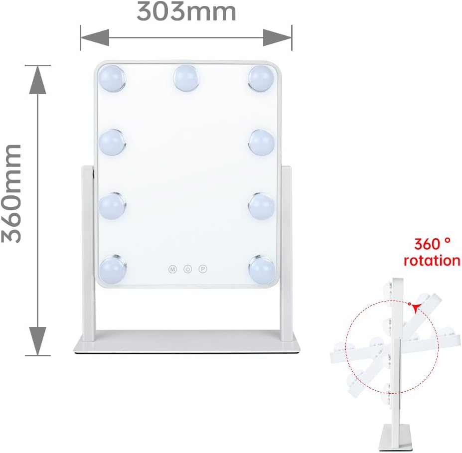 Perfect size and 360° Rotation: The makeup mirror with lights, 14.17"L x 12.04"W, with anti-slip pads at the bottom for stability. It's suitable for small to medium-sized make-up tables and allows viewing from any angle. Memory function and Smart Touch Control: The Hollywood vanity mirror has 3 smart buttons for control, with a short click to turn on/off the lights and short/long presses to adjust color temperature and brightness. The mirror remembers the last brightness and color used. Adjustable Brightness and 3 Color Lighting:Smart vanity mirror with lights has 9 LED bulbs and 3 color settings: cool, natural, and warm light. The color temperature ranges from 3500K to 7500K. The brightness can be adjusted to meet your makeup needs. Sturdy construction, high-quality LED bulbs: Our make up mirror is made from solid metal, designed for durability and heavy use. The superior reflective surface is ensured by top-quality materials, with bulbs lasting up to 50,000 hours. Best Friendship Birthday Christmas Gift - The perfect gift for any women/lady. You’ll love our Hollywood makeup mirror at first sight. We stand by the quality of our luminous cosmetic mirrors with a lifetime replacement or refund guarantee. If you have any issues, feel free to contact us, and our professional team will assist you Product Description