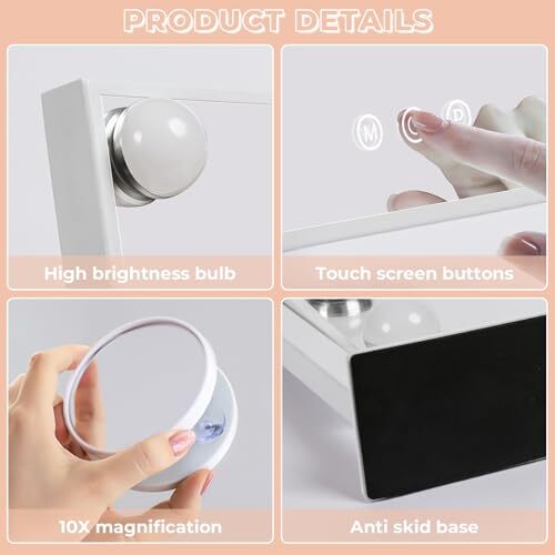 Return Policy Fast Delivery Trusted seller Vanity Mirror with Lights, Lighted Makeup Mirror with Smart Touch Control 3 Colors 9 Dimmable Bulbs, Hollywood Mirror with Lights Detachable 10X Magnification 360° Rotation, White Product Description Great Size: The makeup mirror (11.8" L x 9.8" H) allow you to get your entire face in view at once. Large tabletop mirror is large enough to be used for makeup, grooming and even dressing. 360 degree rotation can be fixed in any position, providing you with a perfect perspective 3 Colors Lighting Modes & Ajustable Brightness : The LED brightness of this hollywood lighted makeup mirror can be changed as you need. This LED vanity mirror provides 3 colors lighting modes so that you can also adjust different brightness to meet your different makeup needs, no matter it is early morning or late night Detachable 10X Magnifier Mirror: Our light up LED makeup mirror has 15X magnifying mirror to help applying mascara, eyeliner, eyebrow and lipstick, creating flawless and delicate makeup, suitable for the pursuit of exquisite you Portable, Compact & Elegangt Design: Overall frame allows you to get your entire face in view at once. The 9 frosted LED globe bulbs can be used continuously with 45000 hours life span. It is very durable without changing the bulb.Fitted the rubber pads on the bottom to prevent the mirror from slipping or falling during use Mirror Material: This makeup mirror is made of high quality mirror glass, known for its high transparency. This glass is resistant to rust and provides superior clarity compared to ordinary mirrors Perfect for friends/lovers/family: Vanity makeup mirror is a good choice for makeup lovers. And also can be widely used in home/beauty salon/dressing room Shipping Returns Payment Shipping Shipping is FREE to all addresses other than APO/PO boxes in the lower 48 states. All our stock ships from US-based warehouses. Shipped via USPS or UPS (depending on location and package weight) Unless stated otherwise, all orders will ship within 24-72 hours of your payment being processed. Check our feedback to see the great reviews of FAST shipping we offer. Returns Seller does not accept returns Payment We currently accept payment via eBay managed payments only. Once payment is cleared, we will dispatch your shipment within 1-3 business days. Please refer to the "Shipping" tab for more information regarding shipping speed to your destination.