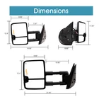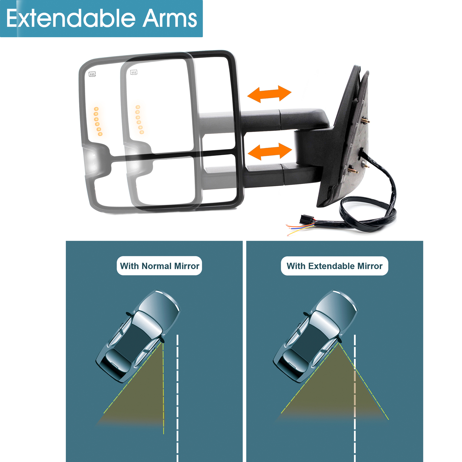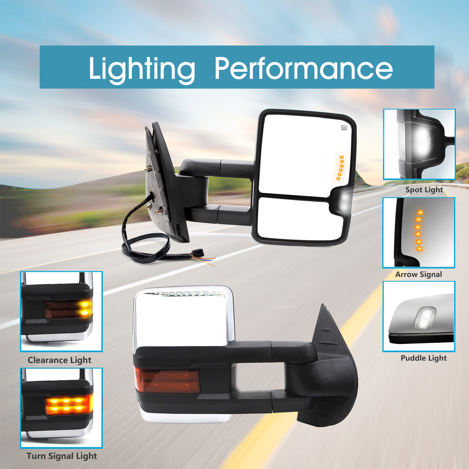 Product Description Detailed description of the product Specifications : Condition New Connector 2 Plug Fold Away Manual Fold Warranty 1 Year Color Chrome Location Passenger Right + Driver Left Side Features: Power Operated Heating Defroster LED Turn Signal Light Arrow Light Auxiliary Light (reserved,need to wire realize) Manual Extend The Length Puddle Light (reserved,need to wire realize) Fits: 2007 2008 2009 2010 2011 2012 2013 Chevrolet Avalanche 2007 2008 2009 2010 2011 2012 2013 Chevrolet Silverado 1500 2007 2008 2009 2010 2011 2012 2013 2014 Chevrolet Silverado 2500 3500 2007 2008 2009 2010 2011 2012 2013 2014 Chevrolet Suburban 1500 2500 2007 2008 2009 2010 2011 2012 2013 2014 Chevrolet Tahoe 2007 2008 2009 2010 2011 2012 2013 GMC Sierra 1500 2007 2008 2009 2010 2011 2012 2013 2014 GMC Sierra 2500 3500 2007 2008 2009 2010 2011 2012 2013 2014 GMC Yukon 2007 2008 2009 2010 2011 2012 2013 2014 GMC Yukon XL 1500 2007 2008 2009 2010 2011 2012 2013 GMC Yukon XL 2500 Note : These mirrors will only work properly on vehicles with these exact options. If your vehicle does not have the options listed, these mirrors may not function properly. No installation guide. Professional installation is highly recommended. In the event the item should fail due to manufacturing defects during intended use, we will replace the part by free.(1 Year Warranty) If you encounter any problems, please contact us and we will provide you with solutions. Thank you! Payment Shipping Returns Contact Us PayPal is our preferred method of payment for all of our eBay sales. For customer service please contact us via eBay MessagesImmediate payment via PayPal is required for all Buy It Now items. If you need special arrangements, please contact us through eBay messages. Generally, all goods will be shipped within 24 hours after the payment on the working day (except for goods sent from China). If you want to cancel the order or change the address, please contact us within 6 hours after payment, otherwise we will not be responsible. It takes 3-5 working days for logistics and transportation to be delivered. If you are not satisfied with your purchase, you may return it, for a refund or replacement - subject to the following: Contact us through eBay messages or the returns link to receive a Returned Merchandise Authorization (RMA) number to ensure proper handling of the return and/or replacement. In order to be eligible for a full refund, less shipping expenses, your returned merchandise must be in its original new condition, as shipped, with all packaging, manuals, and paperwork intact and unaltered. Items which have been opened are returnable, however they will carry a restocking fee. If that product is returned for a refund, the shipping expenses incurred, will be deducted from the refund. If an item is refused, the carrier bills us for shipping both ways, and these expenses incurred on your behalf need to be deducted from your refund If you have a question about a part you should contact us before buying.And If you have any questions after purchase, please contact us and we will provide a satisfactory solution. Payment PayPal is our preferred method of payment for all of our eBay sales. For customer service please contact us via eBay MessagesImmediate payment via PayPal is required for all Buy It Now items. If you need special arrangements, please contact us through eBay messages. Shipping Generally, all goods will be shipped within 24 hours after the payment on the working day (except for goods sent from China). If you want to cancel the order or change the address, please contact us within 6 hours after payment, otherwise we will not be responsible. It takes 3-5 working days for logistics and transportation to be delivered. Returns If you are not satisfied with your purchase, you may return it, for a refund or replacement - subject to the following: Contact us through eBay messages or the returns link to receive a Returned Merchandise Authorization (RMA) number to ensure proper handling of the return and/or replacement. In order to be eligible for a full refund, less shipping expenses, your returned merchandise must be in its original new condition, as shipped, with all packaging, manuals, and paperwork intact and unaltered. Items which have been opened are returnable, however they will carry a restocking fee. If that product is returned for a refund, the shipping expenses incurred, will be deducted from the refund. If an item is refused, the carrier bills us for shipping both ways, and these expenses incurred on your behalf need to be deducted from your refund Contact Us If you have a question about a part you should contact us before buying.And If you have any questions after purchase, please contact us and we will provide a satisfactory solution. Related Products Pair Tow Mirrors Power Heated Turn Signal For 2015-2018 Chevrolet Silverado 2500 Tow Mirrors Power Heated Fits 2014-2018 Chevy Silverado GMC Sierra LH RH Chrome Tow Mirrors Power Arrow Signal Fits 2007-2013 GMC Yukon XL 2500 Left+Right Side Towing Mirrors Manual Fold For 2009-2012 Chevy Silverado 2500 3500 LH+RH Black Tow Mirrors Power Heated Fits 1999-2002 Chevy Silverado 1500 2500 LH+RH Chrome Pair Tow Mirrors Power Turn Signal For 2003-2006 Chevrolet Silverado 1500 Chrome Heated √ √ √ NO √ √ Power √ √ √ NO √ √ Turn Signal Light √ √ √ NO √ √ temperature sensor NO NO NO NO NO NO Puddle Light √ √ √ NO √ √ Arrow Signal Light √ √ √ NO √ √ housing color Black Chrome Black Black Chrome Chrome folding Manual Manual Manual Manual Manual Manual fit for 14-18 Chevy Silverado 1500 15-18 Chevy Silverado 2500 3500 14-18 GMC Sierra 1500 15-18 GMC Sierra 2500 3500 14-18 Chevy Silverado 1500 15-18 Chevy Silverado 2500 3500 14-18 GMC Sierra 1500 15-18 GMC Sierra 2500 3500 07-13 Chevy Avalanche 07-14 Chevy Silverado / GMC Sierra 07-14 Chevy Suburban 07-14 Chevy Tahoe / GMC Yukon 07-13 Chevy Avalanche 07-14 Chevy Silverado