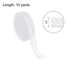 What is this? This lace ribbon is suitable for various DIY projects such as gift wrapping, headbands crafting, wedding decorations, and more. What will I get? Lace ribbon x 1; Length: 10 Yards; Width: 1/2 Inch; Color: White; Are there any advantages of the product? The lace ribbon is comfortable and soft to the touch, allowing it to stretch easily for easy application in different objects and surfaces. This product is versatile and can be used for multiple purposes, such as creating hair accessories, decorating home items and clothes. How to use it? You can cut the ribbon to the desired length using scissors and add any embellishment you like, such as beads or pearls. The material allows you to wrap it around any object tightly to create a seamless and decorative look. What should I notice? Handle the ribbon carefully to prevent it from tearing. It is recommended to store the ribbon in a dry and cool place to ensure its quality and longevity.