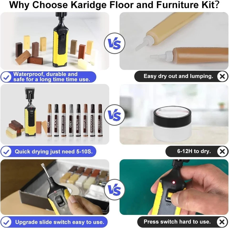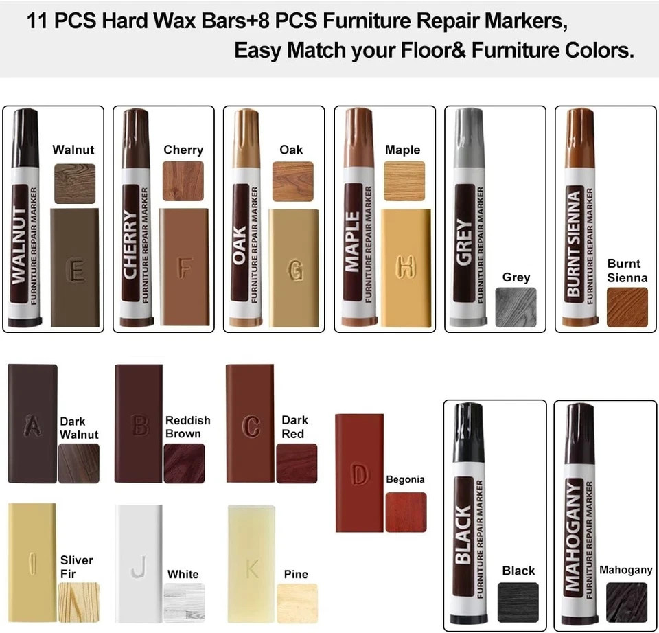 Product Description Restore the beauty of your floors and furniture with this complete Laminate & Vinyl Floor Repair Kit, designed to easily fix scratches, stains, cracks, nicks, and holes on a wide range of surfaces. Whether you're repairing LVP, laminate, hardwood, linoleum, or wooden furniture, this all-in-one kit gives you professional-level results at home—without expensive contractor costs. The upgraded continuous-heating repair pen makes melting wax fast and effortless—no need to hold down a button. Combined with 11 colors of hard wax bars and 8 touch-up markers, you can match virtually any wood tone or flooring shade. Blend, layer, or mix colors to achieve seamless, natural-looking repairs every time. Our premium hard wax formula is fast-drying, waterproof, and abrasion-resistant, ensuring durable, long-lasting repairs on high-traffic floors, doors, tables, cabinets, and more. The kit is simple to use and perfect for DIYers, homeowners, landlords, and anyone looking to refresh damaged surfaces quickly. If you're tired of visible scratches and expensive repair costs, this kit provides everything you need to restore your home’s surfaces—easily, affordably, and professionally. ⭐ 3. Key Bullet Points / Feature List Complete 11-Color Repair Kit – Fix scratches, stains, holes & cracks on laminate, vinyl, hardwood, and furniture. Upgraded Continuous-Heat Pen – No need to hold a button; melts wax smoothly for faster repairs. 8 Wood Repair Markers Included – Match wood grain and touch up light surface scratches with ease. Fast-Drying & Durable Hard Wax – Waterproof, abrasion-resistant, and long-lasting for high-use areas. Wide Surface Compatibility – Ideal for LVP, laminate floors, wood floors, cabinets, tables, doors & frames. Customizable Color Matching – Blend colors to perfectly match floors or furniture tones. Easy DIY Operation – Melt wax into damaged areas, let dry, scrape excess & touch up—done in minutes. Save Time & Repair Costs – Professional results without paying for expensive flooring technicians. Great for Homeowners & Renters – Restore your floors before moving out or refreshing your home. Excellent Customer Support – Backed by responsive service and a 1-year replacement guarantee. 📝 4. Suggested Item Specifics / Attributes Brand: Branded Type: Laminate & Vinyl Floor Repair Kit Model: Floor Repair Kit with Heat Pen Material: Hard Wax, Plastic, Metal (Heat Pen) Color: Multi-Color (11 Wax Colors + 8 Marker Colors) Compatible Surfaces: Vinyl, LVP, Laminate, Hardwood, Wood, Linoleum, Furniture Features: Heat Pen, Multi-Color Kit, Waterproof Wax, Fast-Drying, Scratch Repair Included Items: Heat Pen, 11 Wax Bars, 8 Markers, Scraper, Extra Tools (as applicable) Application: Scratch Repair, Crack Repair, Hole Filling, Stain Coverage MPN: Does Not Apply Room: Any Room / Home / Kitchen / Office / Bedroom Country/Region of Manufacture: — China Finish: Wood-Tone (various) UPC: Does Not Apply