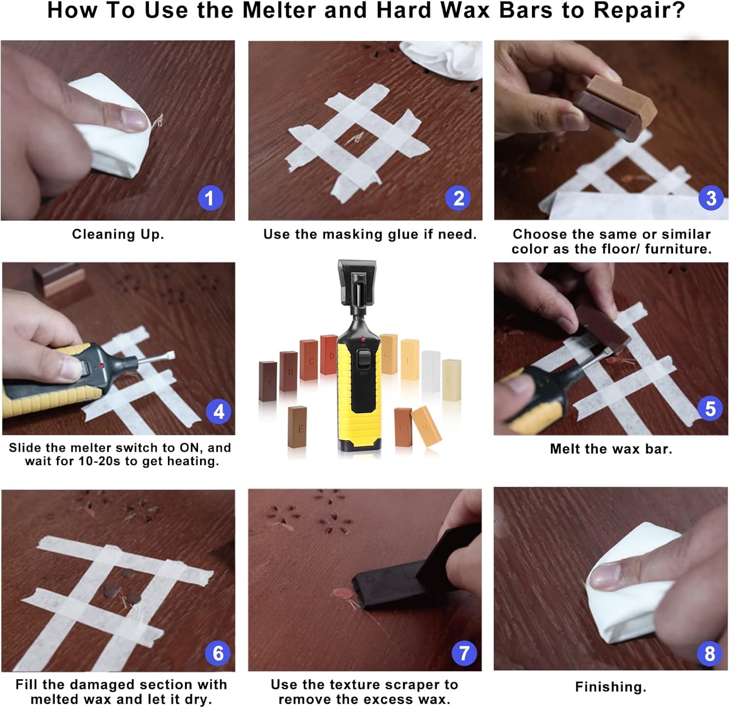 Free eBay listing template designed by dewiso.com Laminate Vinyl Floor Repair Kit with Heat Pen, 11 Colors Hardwood Floor Wax Wood Furniture Touch up Marker Linoleum Lvp Repair Kit Covers Scratches, Stains, Cracks, Holes for Floor, Door, Cabinet FREE AND FAST SHIPPING! Vinyl Floor Repair Kit: Say no to other complicated repair kits and steps, just need a wood floor repair kit for discoloration, stains, scratches, nicks, cracks, or holes on any wood floor and wood furniture luxury vinyl plank, laminate, bed, cabinet, table, frame, door, desk, etc. Your DIY repair work will become simple and professional, also save your time and money Upgraded Hardwood Floor Restoration Kit: After switching from "OFF" to "ON", the heat pen will be heated continuously, you don't need to press the button to heat all the time, after switching from "ON" to "OFF", the heat pen will go off. Anyone can use easily, even for left-handed people, and compared with wood filler and wood putty, our restoration hard wax bars is fast drying and waterproof, after curing, the wax is durable and abrasion resistant Wood and Laminate Floor Furniture Marker Repair Kit More Colors: 11 colors of hard wax strips and 8 wood repair markers can easily match your wooden furniture and floors, high-quality furniture repair repair markers can be used to repair surface scratches or draw wood grain. Apply from light to dark, pay attention to color changes, it is best to mark or blend colors as far as possible where they are not visible, or mix different colors to perfectly match the desired color with your wooden furniture, laminate flooring, vinyl flooring, and linoleum flooring Easy to Use Vinyl Floor Repair Kit: Just put the appropriate color of wax close to the damaged area of the melted wax until it overflows slightly. Wait for a while for the wax to dry, and then use a scraper to remove the excess wax. If necessary, you can use a lighter to speed up the heating of the wax. Excellent Customer Service: We provide a 100% satisfaction customer service team and support 1 year free replacement. If there are any issues with our laminate floor repair kit, we will respond to you within 24 hours Product We offer a 30-Day Return Policy on items which you are not completely satisfied with. You have the option for a full-refund or an exchange of the item. No returns are available on items shipped outside of the US . Shipping We offer Free Shipping to the US and ship within 2 business days of payment, usually sooner. We use UPS express shipping. That's why your products are usually delivered within 3 days . Contact We try our very best to make sure every customer is completely satisfied. If there's a problem , message us! We're happy to help. 24/7 live chat available.
