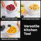 Large Salad Spinner with Plastic Fruit Bowl, Drain, & Colander - Produce & Lettuce Spinner, Vegetable Dryer, Fruit Washer, Easy & Compact Kitchen Tool - Pasta & Fries Strainer - Qt Turn chore into pleasure and make your salads tastier. Forget washing gem lettuce by hand, drying chopped salad with tons of paper towels, spraying water all around the kitchen, and bland, watery salads. Our easy rotary handle makes spinning effortless, so you can enjoy the convenience of a quick, mess-free, and tasty salad. 3-in-1 Multifunctional Kitchen Gadget. All parts are separated for easy use and cleaning. You can use the clear base as a serving bowl or salad mixer and the basket as a convenient colander or vegetable washing basket. That's more space in your cupboards and fewer dishes to wash. Built-In Drainage System. You can wash and dry greens, fruits, and vegetables, without removing the lid. Just add water through the lid as you spin-wash, tip salad spinner to pour out water through the opening in the lid, and spin again to remove excess water and dry. Smart Design. Non-skid base provides stability and control, so the bowl remains steady on your countertop while using the salad spinner dryer. Two locking clamps on the lid prevent water and greens from flying around your kitchen and making a mess. Not Just For Salad. Use it as a vegetable spinner when cleaning veggies or as a fruit washer before enjoying your berries. You can even use it to spin out any remaining water from pasta, so your sauces stick better, or to remove excess oil from french fries. It's one of the most useful gadgets in any kitchen. Practical kitchen tools Say hello to one of the best and most versatile kitchen tools and gadgets you never knew you needed!