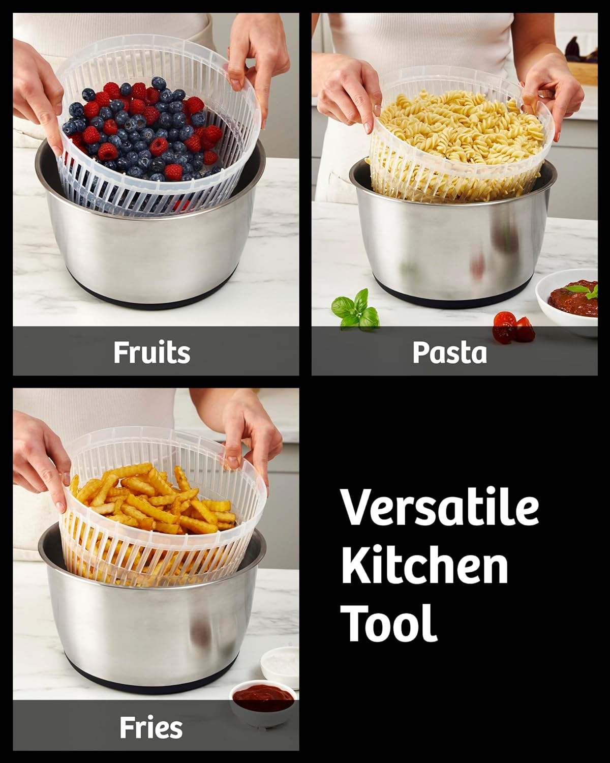 Turn Chore into Pleasure - Say goodbye to hand-washing lettuce, drying chopped salad with paper towels, creating a watery mess, and settling for bland salads; Our stainless steel salad spinner large effortlessly spins quick, mess-free, and gourmet food. Compact Kitchen Tool - You can use the stainless steel bowl for serving or as a salad mixer and the basket as a convenient colander or vegetable washing basket - that's more space in your cupboards and fewer dishes to wash thanks to our large salad spinner push down! Easy Built-in Drainage - Easily clean, dry, and enjoy fresh greens, fruit, and veggies with our removable lid design vegetable spinner; Simply add water through the lid, spin-wash, pour out, spin again to remove extra leftover water, and voila! Smart Design - The non-skid base provides stability and control, so the bowl container remains steady on your counter while using the fruit cleaner lettuce spinner pump; Features a brake button for spin control at your fingertips - simply press to stop Product Description Stainless Steel Pump Salad Spinner 3-in-1 Multifunctional Kitchen Gadget. Salad spinner best rated all parts are separated for easy use and cleaning. You can use the clear base as a serving bowl or salad mixer and the basket as a convenient colander or vegetable washing basket. That's more space in your cupboards and fewer dishes to wash. Smart Design : Brake Button Control. Non-skid base provides stability and control, so the bowl remains steady on your countertop while using the salad spinner dryer. Brake Button Control.Press the brake button to stop. Built-In Drainage System. You can wash and dry greens, fruits, and vegetables, without removing the lid. Just add water through the lid as you spin-wash, tip salad spinner to pour out water through the opening in the lid, and spin again to remove excess water and dry. Not Just For Salad. Use it as a vegetable spinner when cleaning veggies or as a fruit washer before enjoying your berries. You can even use it to spin out any remaining water from pasta, so your sauces stick better, or to remove excess oil from french fries. It's one of the most useful gadgets in any kitchen.