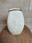 This exquisite Lenox Masterpiece vase is a true masterpiece with its beautiful floral pattern and elegant 24K gold trim. The ivory porcelain vase measures 8 1/4" in height and features a medium size that makes it perfect for displaying flowers or other decorative items. The embossed finish adds a touch of sophistication to the vase, making it a great addition to any collection. Made in China, this table vase is a perfect example of Lenox's craftsmanship and attention to detail. The brand is known for producing high-quality porcelain items, and this vase is no exception. Its classic design and timeless appeal make it a great gift for any occasion or a lovely addition to your own home decor.