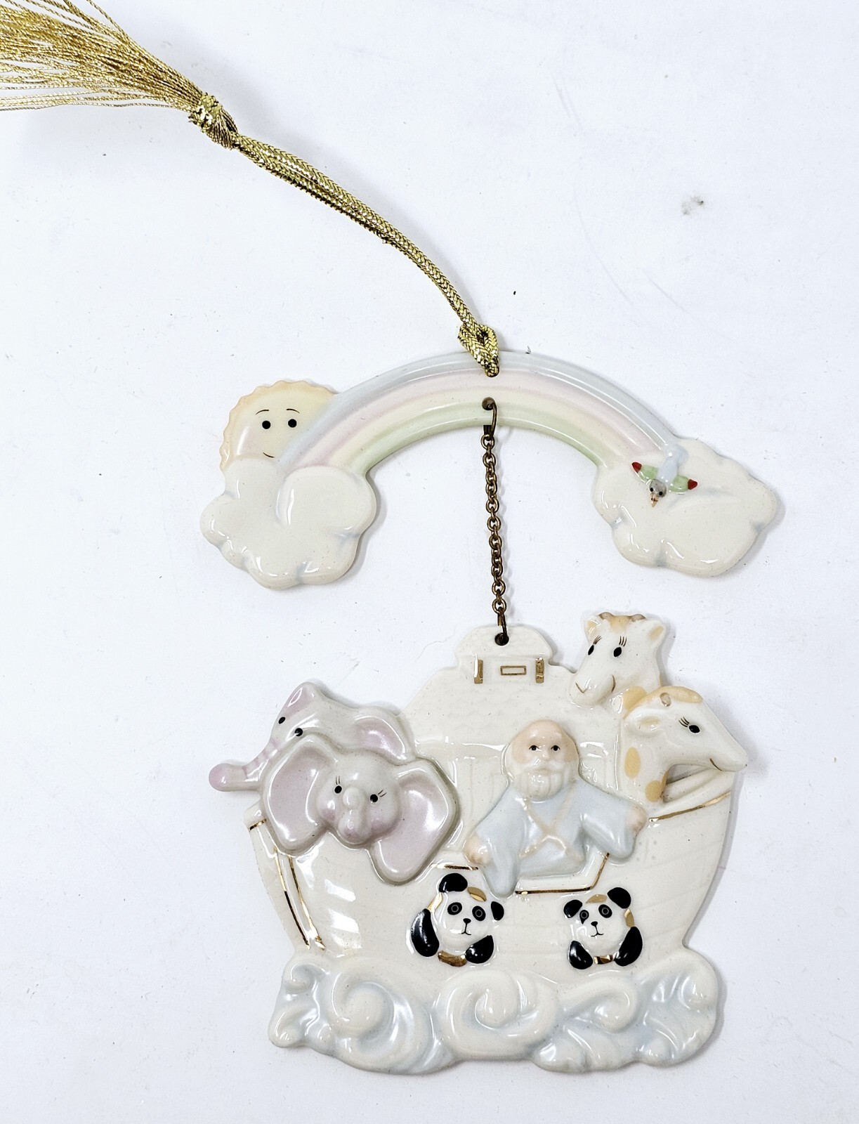 Lenox Noah's Ark with Rainbow Porcelain Ornament #6119044 with Box Christmas Nice clean ornaments. Box in good shape. This exquisite Lenox porcelain ornament is a must-have for collectors and enthusiasts out there. Celebrate the holiday season in style with this medium-sized ornament that showcases a boat and rainbow design, depicting Noah's Ark. This vintage item was manufactured in 1999 and comes with its original box. Featuring a hanging feature, this Lenox Noah's Ark ornament is perfect for your Christmas tree or as a decorative element in your home. The ornament measures 3.75 inches in width and is in excellent condition. Add this to your collection today and make your holiday season more colorful with this beautiful Rainbow Porcelain Ornament.