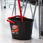 Libman High Power utility bucket with red handle. Made of polypropylene for superior resistance to cleaning chemicals. Bucket has dual pour spouts to help ensure no spillage when pouring from either side. Fluid measurements molded inside the bucket for precise mixing of cleaning chemicals. Measurements: 10.25” tall with a width of 16” and depth of 10”. Molded in black to hide any stains or discolor due to harsh cleaning chemicals. Comfortable ergonomic handle that protects the users’ hands when bucket carrying. 3.5 gallon capacity. Solid Polypropylene one piece molded bucket with handle Capacity of 3.5 gallons, 13.25 liters, 448 ounces Comfortable ergonomic handle for ease of carrying even with a full bucket Fits all standard sponge and wet mops with a 15.5 inch by 9.5 inch opening and total dimensions of 10.94 inches by 11.56 inches by 15.81 inches Also can be used to carry household tools like sponges and rags Heavy duty 12 melt polypropylene construction for both the bucket and the handle.