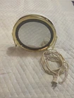 Lighted (electric) 7” frame with 6” mirror surface MAGNIFIED MAKE UP MIRROR. Very Good Condition. Looks new. No scratches, dents or damage of any kind. Cord is in perfect condition. Gold chrome base and frame with white painted backing. One light setting with click dial on cord. On sturdy chrome stand for table or counter top. Vintage item that is as relevant today as when it was manufactured.