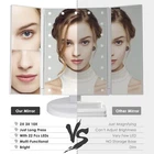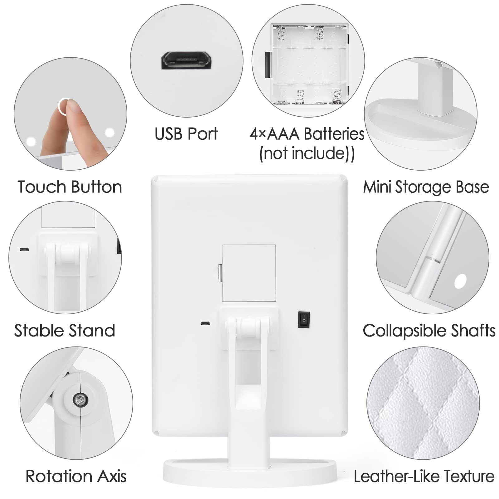 · 【10X,3X,2X Magnification】- lighted makeup mirror has 3 panels magnifying and wide-angle viewing; see clearly the tiniest of beautiful details, perfect for touching up your eyebrows, applying eyeliner, and creating a flawless look. · 【10X,3X,2X Magnification】- lighted makeup mirror has 3 panels magnifying and wide-angle viewing; see clearly the tiniest of beautiful details, perfect for touching up your eyebrows, applying eyeliner, and creating a flawless look. · 【Touch Screen Switch Controls 22 LEDs】- we chose the most frequently used lights in light designing—warm, cold, and natural light, and you can apply either light or heavy makeup for any occasion perfectly: the warm light fits for soirees; the natural light has 97% of sunlight similarity and fits for outdoor occasions; the cool light fits for office makeups, long press to control LED lights brightening or dimming. · 【Dual Power Supply】- makeup mirrors powered with USB charging cable or 4×AAA batteries, including USB cable, but chargers and batteries are not included. · 【180° Rotation And Custom-Adjusted】- fixed in any position as needed, and the three-fold vanity mirror provides a wide-angle view, and the side mirror panels can be custom-adjusted to suit your needs. · 【Compact & Portable】- tri-fold design, after folded, the mirror decorates your dresser with delicate leather-like texture, and you can put it directly into your suitcase, it's safe to carry and not easy to break, so it's the best mirror for travel.