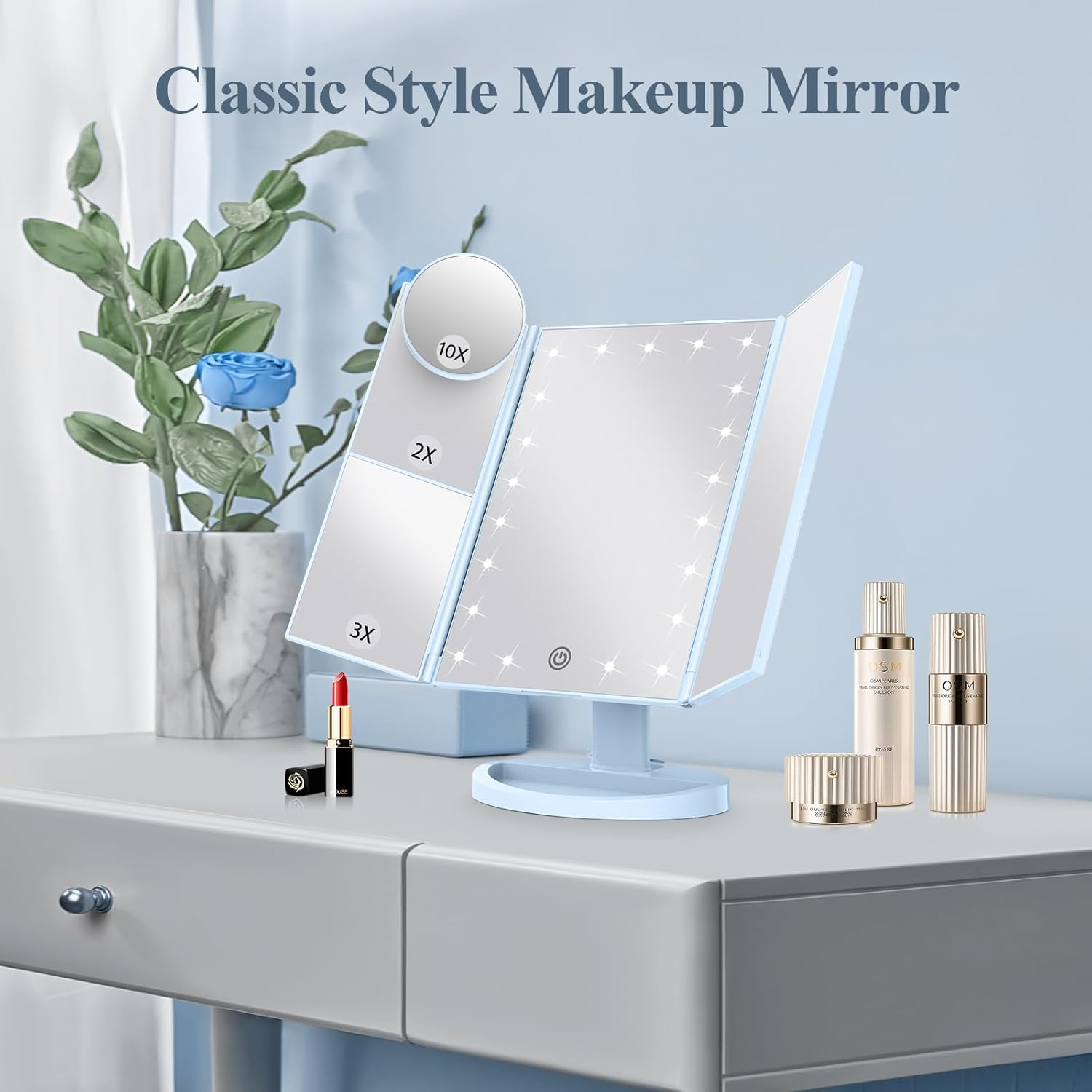 Built in 21 LED bulbs; HUONUL makeup mirror provides a good brightness for makeup; dim or brighten up the lights with a long pressing of touch screen switch 10X,3X,2X magnification modes; lighted makeup mirror has 3 panels magnifying and wide-angle viewing; see clearly your face and make a flawless makeup, suitable for desk makeup and handheld use Dual power supply; makeup mirror with lights powered by USB charging cable or 4xAAA batteries; USB cable included, Charger and batteries not included Adjustable degree rotation & touch control; adjust the mirror as per the suitable viewing angle you wish, easy and convenient touch switch, easily control the LED makeup mirror when doing makeup Top gift for women; birthday gift, Valentine's Day gift, Mother’s Day gifts, Christmas gifts for teen girls, family, wife, or girlfriend, or another special day gift; Customer first; we can help if you have any issues with your purchase Product Description
