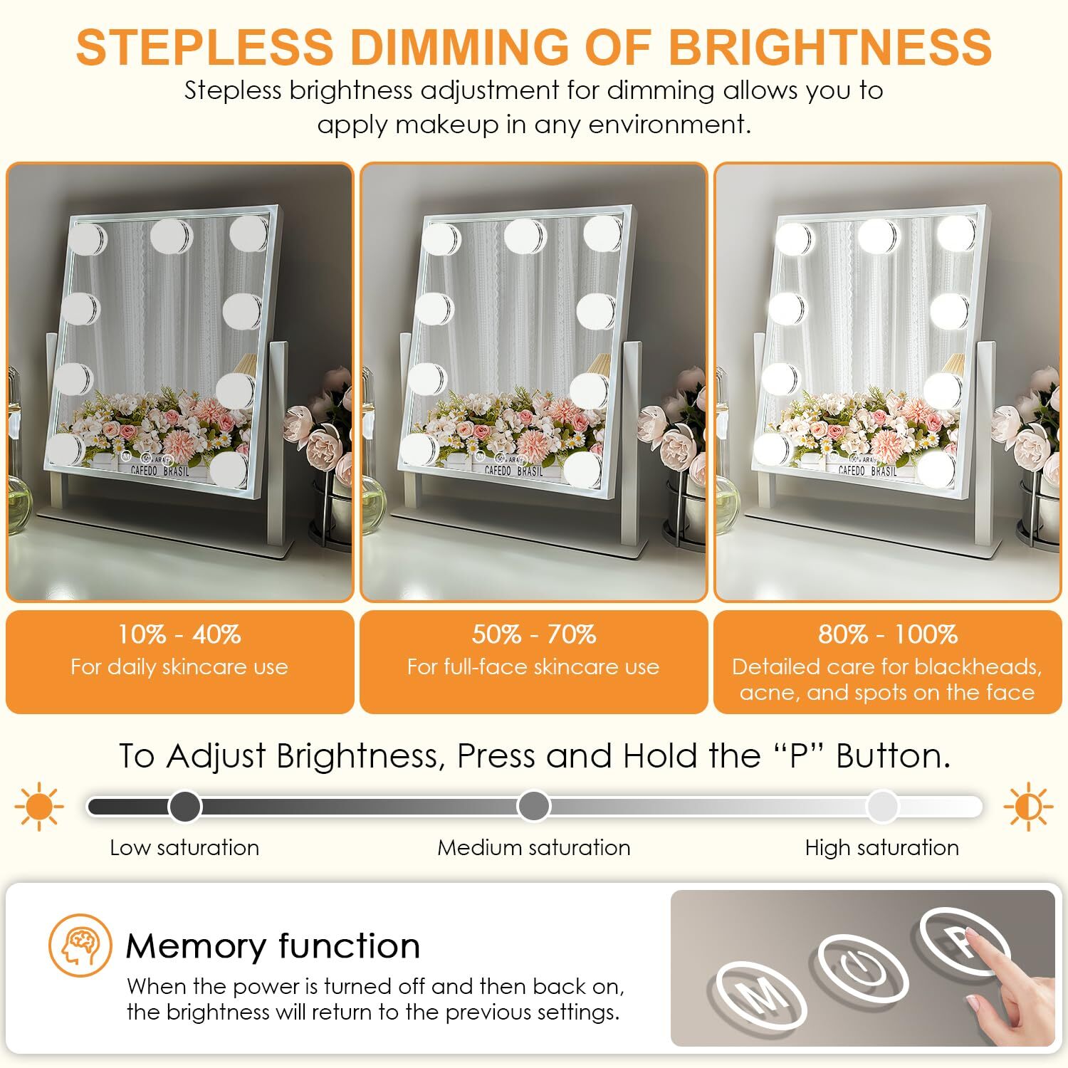 Welcome to our stores! Exclusive Deals Just for You! We guarantee you will be satisfied. Makeup Mirror with Lights, Lighted Vanity Mirror with 9 Bulbs, 3 Color Lighting and Dimming, Touch Control, 360° Rotation, White Product Gallery Product Information Features ✔️【Touch control】: this makeup mirror is designed with a touch screen mirror. The left “M” button on the touch screen is used to change the light settings for 3 modes, the middle button (power switch) is used to turn on and off, and the right “P” button is used to adjust the brightness. 💡【3 color variations and adjustable brightness】: this makeup mirror has 3 adjustable lighting modes (warm light/natural light/cool light), you can also adjust the brightness according to different makeup times and scenes to ensure the right lighting effect when applying makeup 🔍【Detachable 10X Magnifier】: this makeup mirror offers two magnification options for versatile use. The 1X option provides an integral view, while the detachable round mirror offers 10X magnification for precise makeup application. Viewing distance is about 8-10 cm to avoid dizziness and distortion. 🎁【Gift for lover, family and friends】:This makeup mirror is perfect to give as a gift, not only looks elegant, but also has a high brightness of the mirror light. Gift her a makeup mirror to make her makeup perfect every time! 💕【After-service】: your satisfaction is important. If you have any questions or problems while using the product, please contact us and we will provide a satisfactory solution for you! Thank you for choosing us! Contact Information ☎ If you have any questions, feel free to reach out through the eBay messaging system. We respond to all inquiries within 24 hours. Payment Options 💳 We accept PayPal, credit cards, and other payment methods supported by eBay. Please ensure your payment details are up-to-date to avoid any delays. Shipping Details We ship to the address on your eBay account. Please verify your address before completing the purchase. Delivery typically takes 3-5 business days. In case of delays, please allow an additional 1-2 business days due to postal service issues or technical problems. We use reliable shipping services such as UPS, FedEx, and USPS. Shipping is only available to the 48 contiguous states. We do not ship to Alaska, Hawaii, US territories, APO/FPO addresses, or PO Boxes. Local pickups are not available. If there are any issues with your delivery, please contact us promptly. Customer Feedback 🌟 We value your feedback and strive to earn your trust. If you're not satisfied with your purchase, please contact us and we'll work to resolve the issue. Return Policy - We offer a 30-day money-back guarantee. - If the item is defective or you are not satisfied, contact us for a replacement or refund. - All returns must be sent to the address provided upon contacting us.