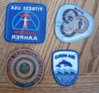 Lot (4) Adventure/ Travel Patches- Sea World Orlando Fla.- 2.75"x2", UNUSED, Fitness USA Junior AAHPER- 3" square, UNUSED, Skylab Carr-Gibson-Pogue- 3" square, UNUSED, Pledged to Courtesy and Safety- 3" round, possibly used (see photos)