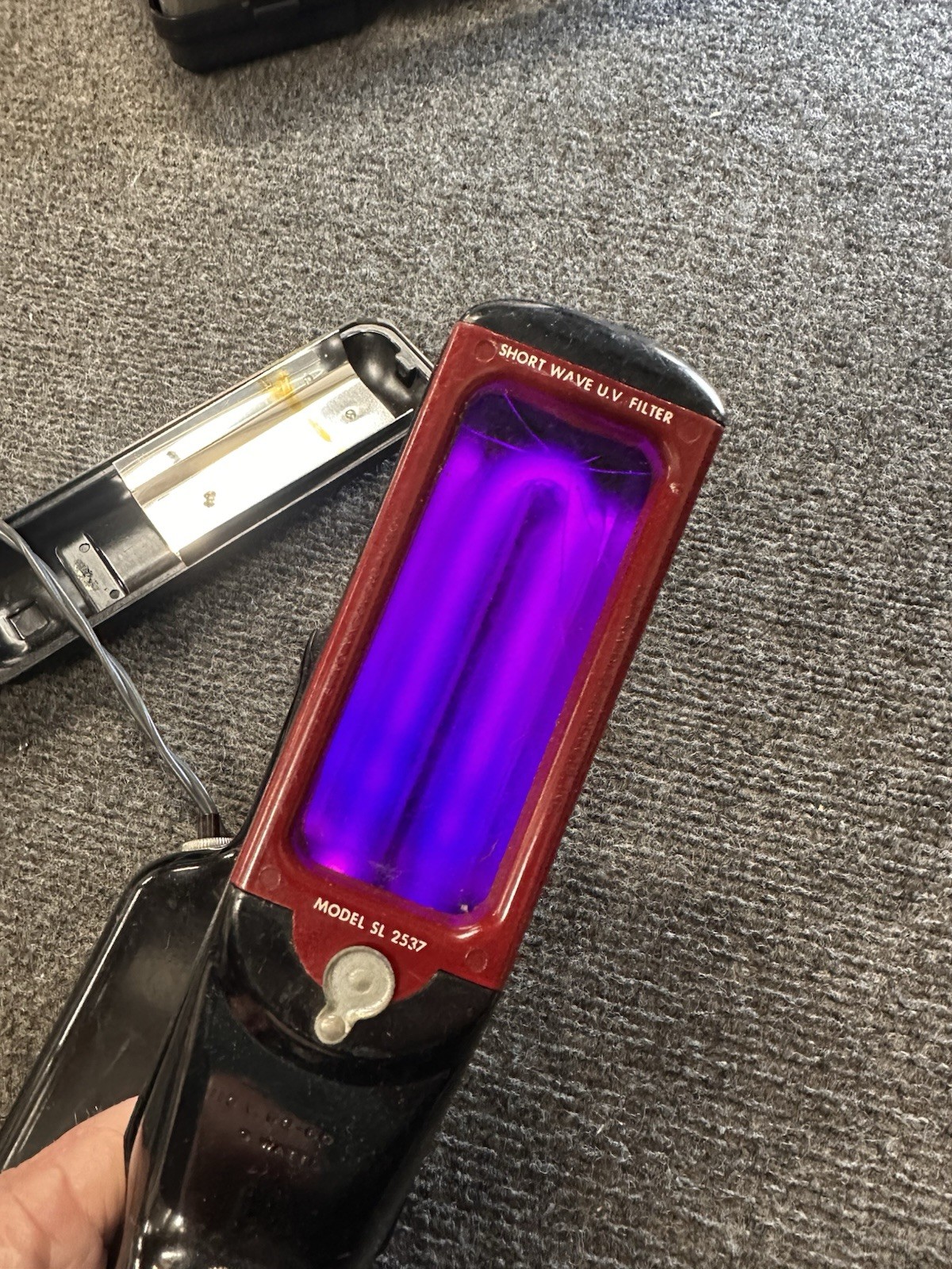 Lot of 2 Mineralight UV Ultra Violet Lamp Wands w/ Short & Long Range Filters, 1 turns on briefly, 1 is disassembled both sold for parts or repair, the long range filter plastic is chipped as shown you get everything in picture for 1 price, maybe you can both working? all sod as-is condition wall 1 MZ bin