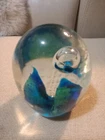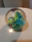 This lot of two modern art glass paperweights features a beautiful fish aquarium design, perfect for any lover of marine life. The larger paperweight stands at 4 inches tall and the smaller one at 3 inches, making them ideal for display on any shelf or desk. The multicolored glass and intricate production style of these paperweights make them true works of art. Crafted in the 1990s, these paperweights are unmarked and their era is unknown. They are, however, perfect for collectors of paperweights and those who appreciate unique and beautiful decorative items. Add a touch of the ocean to your home with this stunning pair of paperweights.
