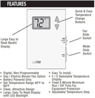 Lux Pro PSD010BF Digital Non-Programmable Thermostat for Home, Heat White Product Details Brand: LUX Model Name: PSD010BF-010-FBA Product Dimensions: 1.25"D x 3.5"W x 5.25"H Special Feature: Low Voltage Color: White Temperature Control Type: Digital Included Components: PSD010BF-010 Mechanical Non-Programmable Thermostat Power Source: Battery Powered Item Weight: 0.12 Pounds Voltage: 24 Volts Material: Plastic Shape: Rectangular Display Type: Digital Control Type: Button Control Control Method: App Mounting Type: Wall Mount Style: PSD010BF Backlight: Yes Number of Batteries: 2 AA batteries required. (included) Manufacturer: EME Delaware Item Weight: 1.92 ounces Item model number: PSD010BF-010 Batteries: 2 AA batteries required. (included) Is Discontinued By Manufacturer: No Offers digital accuracy for precise temperature control and reliable performance Includes a fan switch for convenient control Operates solely on battery power for a convenient and portable solution Features a large LED illuminated digital display for easy reading and visibility in any lighting conditions Boasts an attractive slim design, adding a sleek and modern look to any room Battery powered, digital thermostat with large, easy-to-read display for heat only systems.