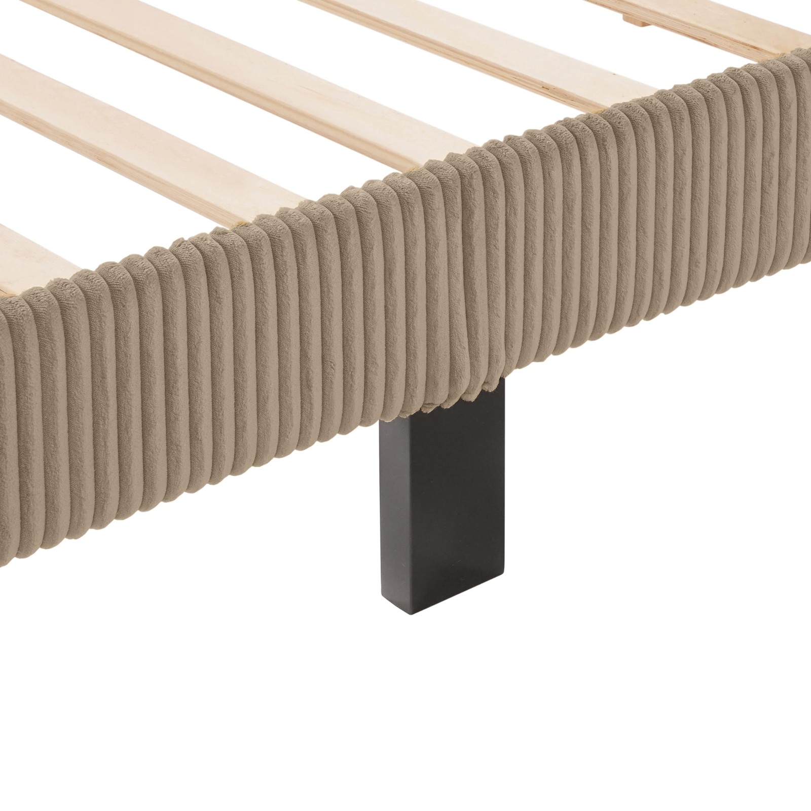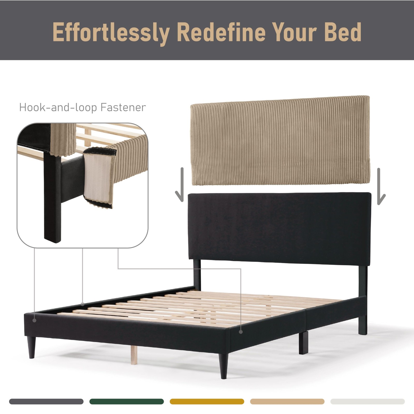 🌟HIGH-END MATERIAL: Crafted from premium chenille, this slipcover combines durability and breathability with a soft, luxurious feel. The unique texture enhances visual appeal and adds depth to your bedroom. 🎨MULTI-COLOR OPTIONS: Available in elegant dark gray, calming green, vibrant yellow, cozy brown, and adaptable ivory. Select your favorite slipcover to match the season or your mood for a fresh new look. 🧽DURABLE & EASY TO CLEAN: This corduroy fabric resists wear and tear. Simply vacuum to remove surface dust, or machine wash the fabric cover in a laundry bag and air dry to maintain it. 🏠PERFECT FIT & DECOR BOOST: Designed specifically for bed frames (bed frame not included), this cover boasts a unique striped pattern suitable for modern or transitional styles, elevating your bedroom decor effortlessly. 🛠️EASY SETUP: Attach fabric cover along headboard, rails and footboard with the easy velcro backing. Cover can be removed and changed within minutes. No tools needed. 🛌🏿NO BOX SPRING REQUIRED: Enjoy a hassle-free setup. Our bed frame includes sturdy slats, providing instant comfort when you lay your mattress. Experience quality sleep effortlessly.