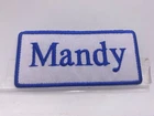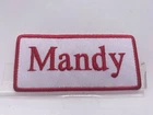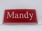 THIS AUCTION IS FOR A NEW EMBROIDERED IRON/SEW ON NAME PATCHES) ( SIZE 1-1/2 INCHES TALL AND 3-1/2 INCHES WIDE) MANDY (BORDER AND NAME EMBROIDERED ) (AVAILABLE IN BLUE ON WHITE RED ON WHITE AND WHITE ON RED (NEW) SHIPPING FOR THIS ITEM WILL BE (FREEEE IN THE U.S.A.) PLEASE PAY THROUGH EBAY. ITEMS WILL BE SHIPPED 1 BUSINESS DAY AFTER RECEIVING PAYMENT. THANK YOU FOR LOOKING! ! CLICK HERE TO Save as Favorite Seller Most items will be shipping in a regular letter envelope and will NOT have a tracking number. All items will be shipped the next day, if you pay before 10:00am pacific time your package will ship same day. If you pay on Saturday you package will ship on Monday unless it is a holiday it will ship on Tuesday. I ship 6 days a week. by 10:00am pacific time. INTERNATIONAL BIDDERS SHIPPING FOR THIS ITEM WILL BE $3.00 FOR THE FIRST PATCH OR SET AND .25 FOR EACH ADDITIONAL PATCH. THANK YOU FOR WATCHING <div style="text-align:center"><a style="text-decoration:none" href="http://mostpopular.sellathon.com/?id=AC583636"><img src="http://www.sellathon.com/Resources/Images/countercredit.gif" border="0"></a></div>