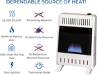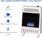 MN100TBA-B Ventless Natural Gas Blue Flame Space Heater with Thermostat Control TECHNOLOGY: This compact Blue Flame mini heater produces 10000 Maximum BTU using Natural Gas and heats up to 500 sq. ft. area; This is a great heater for office, bedroom, living room, and other residential use DEPENDABLE: Thermostat control on the heater offers High/Medium/Low Thermostat Control; Ideal for greater heat flow that could add a warm atmosphere as a small space heater STYLISH: Without compromising function for beauty, this versatile small heater has been redesigned for a slim & modern profile to effortlessly fit in your room; Mount on a wall with included hardware or place on a floor with Base Feet (Included) SAFE: Push button ignition with built-in pilot oxygen depletion sensor (ODS) immediately shuts down the garage heater if carbon monoxide or lack of oxygen is detected; ANSI Certified to ensure safety CONVENIENT: No electricity is required for this personal heater, making it perfect for power outages or any in-house emergencies; Includes Wall Mount and Base Feet ProCom Natural Gas Ventless Blue Flame Heater with Base Feet - 10,000 BTU, T-Stat Control - Model# MN100TBA-B 17.0 "h x 6.38 "h x 23.0 "h. Weight: 13.77 lb Item model number MN100TBA-B Style Natural Gas Assembly required No Number of pieces 1 Country of Origin USA Fuel Type Gas Room Type Bedroom, Home Office, Study Room Power Source Gas Powered Heating Method Gasoline Batteries required No Care instructions Hand Wash Burner type Radiant Heating Coverage 500 square_feet Form Factor Mat Heat Output 10000 British Thermal Units Included Components Ventless Blue Flame Heater with Base Feet Indoor/Outdoor Usage Indoor Item Weight 13.77 pounds Special Feature Overheat Protection Mounting Type Floor Mount Color White Recommended Uses For Product Office, Home Product Dimensions 6.38"D x 17"W x 23"H Size 10000 BTU