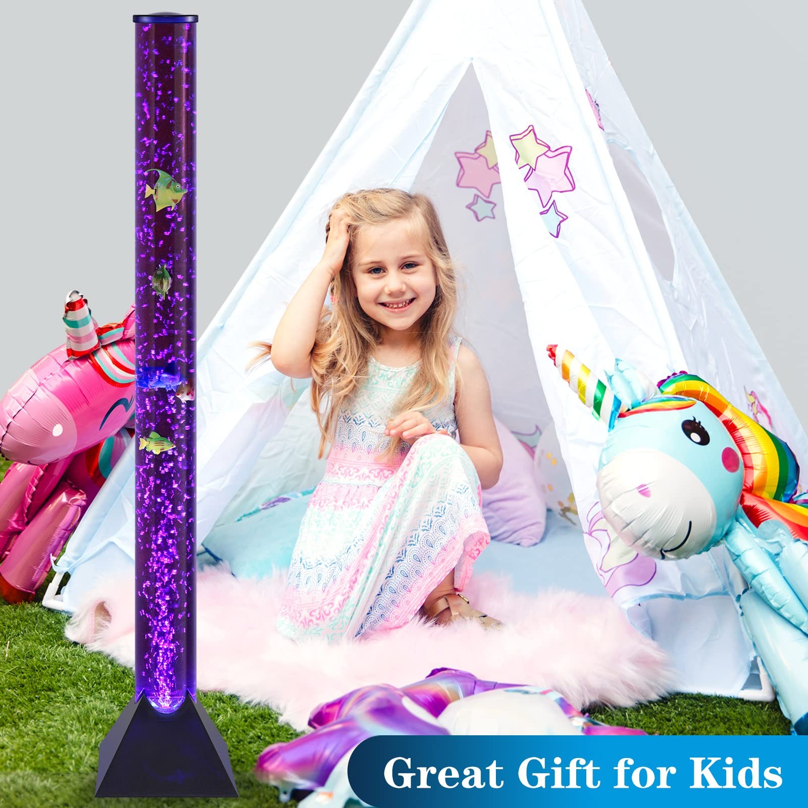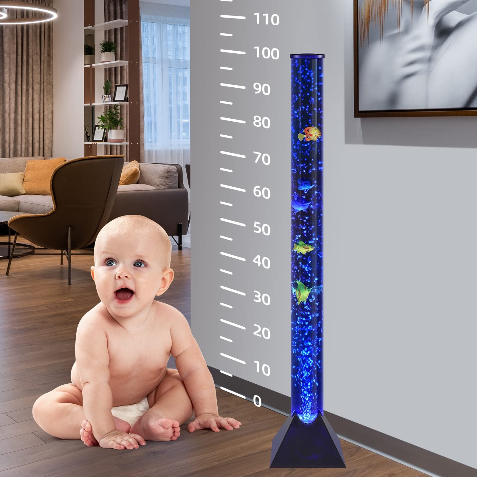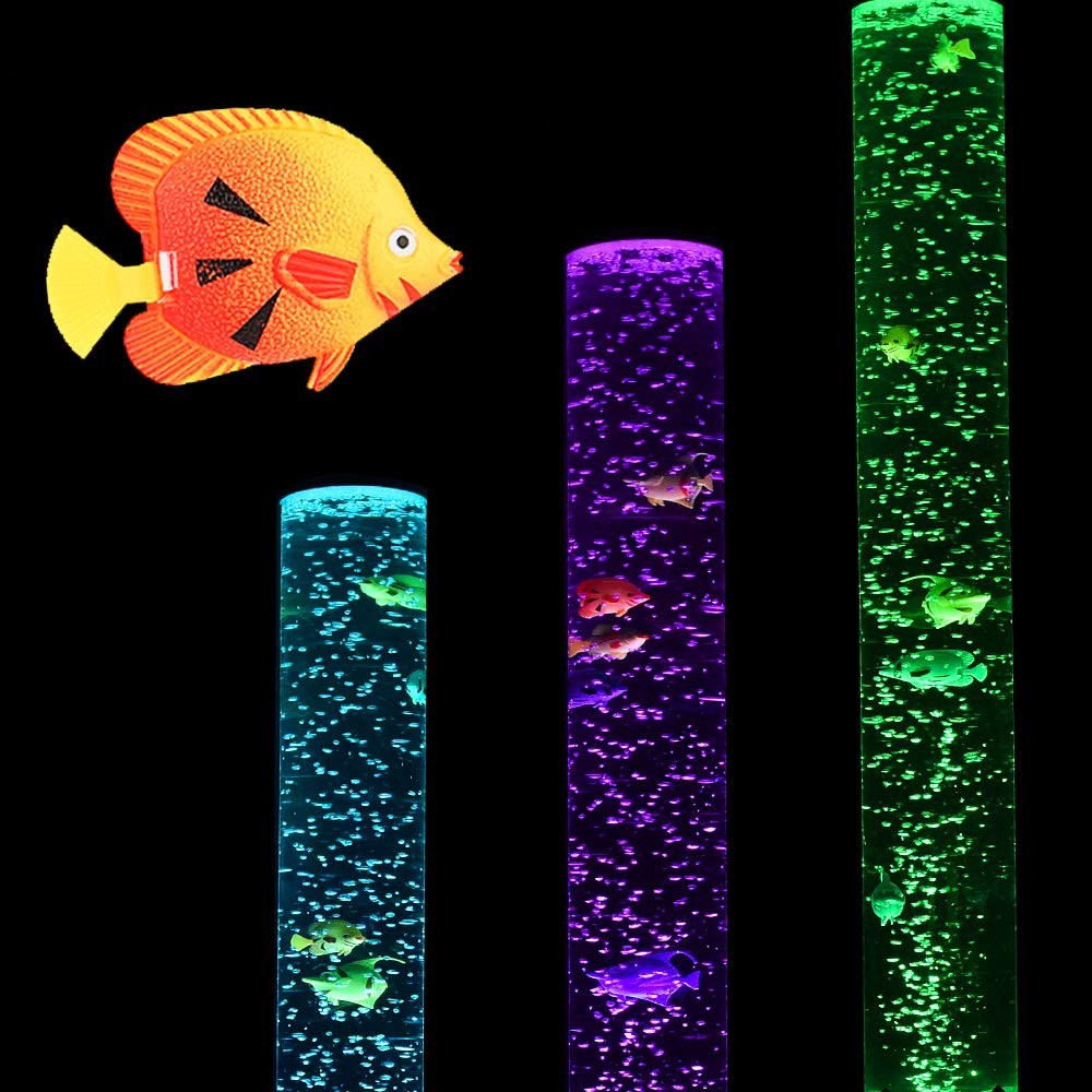 MOONSAY Sensory Bubble Lamp - 3.3ft Bubble Tube with Fish, Remote Control - Fake Fish Tank Floor Lamp with Color Changing for Room Decoration (Calming Effect) Features: ◉ Remote Control: You can turn on /off , and adjust the color changing with remote control. ◉ Calming Effect: Watching the fish float up and down, enjoying the amazing color changing, bring you a calm and peaceful atmosphere. ◉ Decoration: Perfect for homes, schools, sensory rooms, workplaces, and more. It is important that this product is placed on a level surface and where it will not be knocked over. Specifications: Height: 3.3ft / 39.3inch Color: 20 Color Changing Plastic base & Top Clear Tube On/Off Switch and Remote Control Power Adapter Package Includes: 1 bubble floor light 1 remote control 5 Fish 【Perfect after-sales 】Your satisfaction is our purpose.immediately if you aren’t satisfied with our products,or you have other requirements on our services 【Create a mystery & lovely atmosphere】:It comes with 3.6Watts power-saving RGB Colour Changing Bulbs light. It provides even light and brightness moderate, the light is very gentle and comfortable on the eyes, which builds a Warm and Comfortable atmosphere. The floor lamp fits perfectly in any room from modern to traditional décor. Enjoy Warm and Comfortable, Romantic, Gently and soft, Quiet, Cheerful time 【Mood light for relaxation & meditation】: It can help you relax and ease your tight emotion, This soothing mood light creates a stimulating and a calming environment for children and adults whilst providing a pleasurable and enchanting visual point of focus or diversion. It is great for calming your to fall asleep & use the slow motions of the jellyfish to relax and quiet down after a long day of work. 【Wide range of useage】:Living room, office room, conference room. Create a comfortable and relaxing atmosphere. Also can be used as a gift for your loved ones. 【Easy to operate & assemble】: Very Convenient to adjust the color and brightness in need wherever through a remote! Long-range control, easy to operate. The remote can control 2 RGB bulbs synchronously or separately