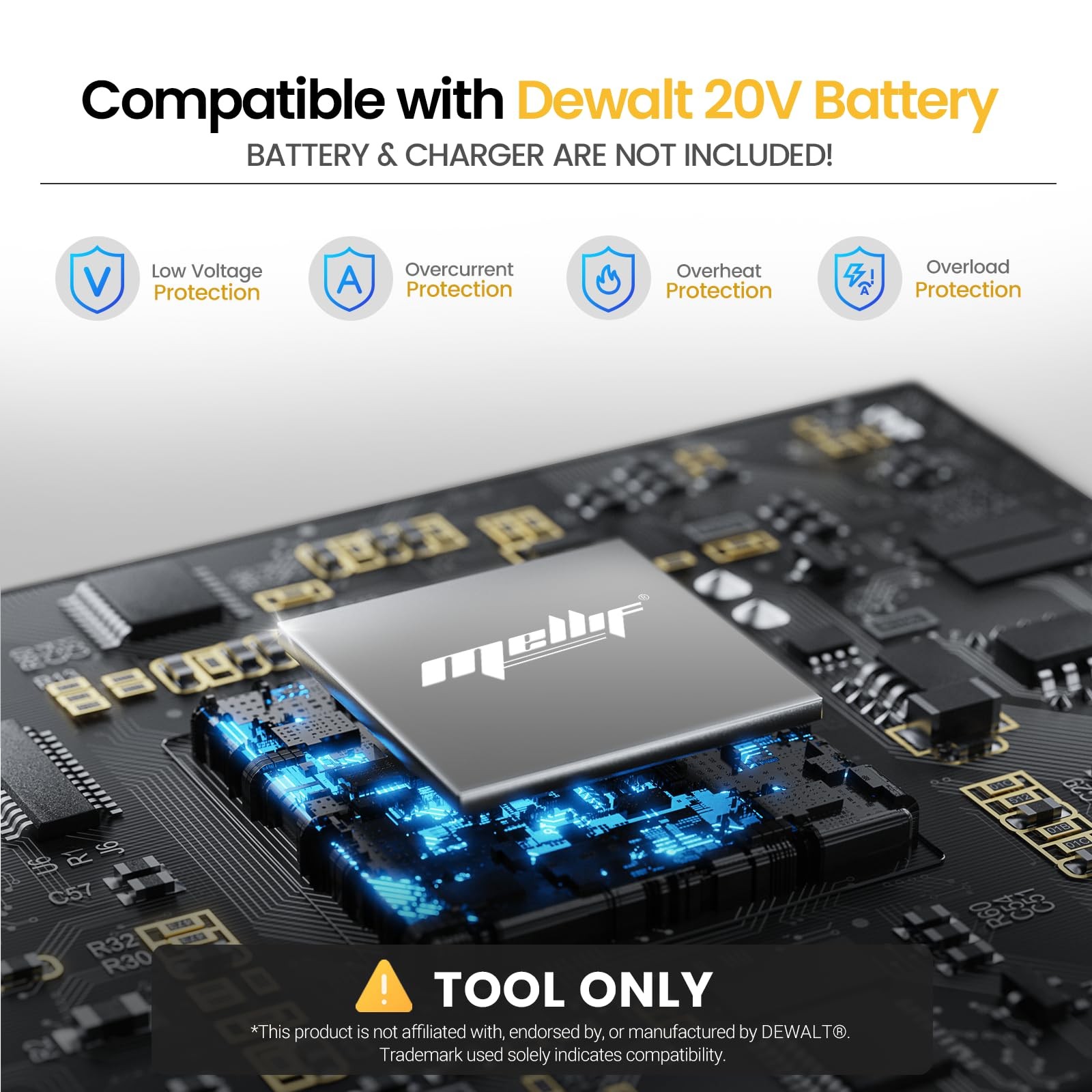 Perfect fit: The vacuum is compatible with dewalt 20v max batteries and Mellif 20V batteries. This product does not include a battery or charger, it is just a tool. Just plug in your own batteries on our professional vacuum cleaner and start your cleaning! Worry-free from charging: After testing, 3AH battery can maintain the machine for 25-30min use. If you owned more than one battery, you can easily change another fully charged battery rather than the long wait. Furthermore, our machine come with low-voltage protection to protect your battery. The machine will automatically shut down when your battery is about to drain. Muti-Functional nozzle: Our package come with three different nozzle and brushes. It’s your best assistant when you deal with different situation. You can easily suck out dust, pet hair, sand, food debris even the dirt hide in the sofa. Machine Performance: Our hand-held vacuum cleaner equipped with 93W high-power motor providing 8KPa super suction. 600ML container is included for wastes collect. The detachable container is conducive for rapid garbage dumping. Warranty & Service: At Morclin, We provide 60-month warranty for the vacuum cleaner. Our Support team is available 24/7, so please contact us if you have any question about the product