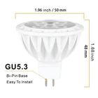 Energy Efficient MR16 LED Dimmable Cool White 6000K Input : AC/DC 12V Output : 5W , 450 LM Beam angle : 38 degree Color temperatrure : 6000 K ( Daylight White ) Color Rendering Index ( CRI ) : 85 Ra LED Qty : 8 pcs Dimension : dia. 50 mm , height 48 mm ( 1.97*1.89 inch ) Material of the shell : heat conductive plastic Features : 1. UV free for art display without fading it , could be used in art gallery and museum 2. GU5.3 LED bulb 38 degree narrow beam angle led spot light , focus lights on any where you want them to accentuate items 3. Standard size of MR16 halogen : dia. 50mm , height 48 mm , gu5.3 bi-pin base 4. Note: ONLY works with 12V AC/DC low voltage. Please make sure you have a 12V transformer if your working voltage is 100-240V , to avoid a burn out. 5W GU5.3 MR16 12V Spotlight Bulb dimmable , smooth dimming function enables you to adjust your favor brightness , no buzzing , no flicker , dimming range between 10%-100% LED mr16 light bulbs daylight white , clear and bright, CRI>85 , more vivid and natural lights Energy saving 5w led mr16 track light bulbs 450 lumens , equal to 50 watt mr16 halogen bulb , 90% of energy saved MR16 narrow spotlight bulb LED with 38 degree beam emit beautiful light spot Material: heat conductive plastic , high quality led bulb with good heat dissipation , protect the bulb from getting too hot , long lifespan 30,000 hrs